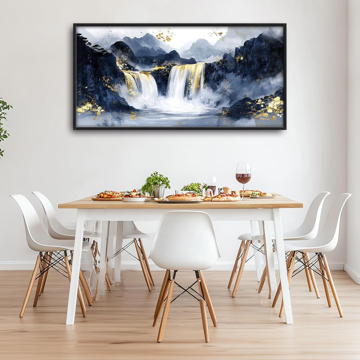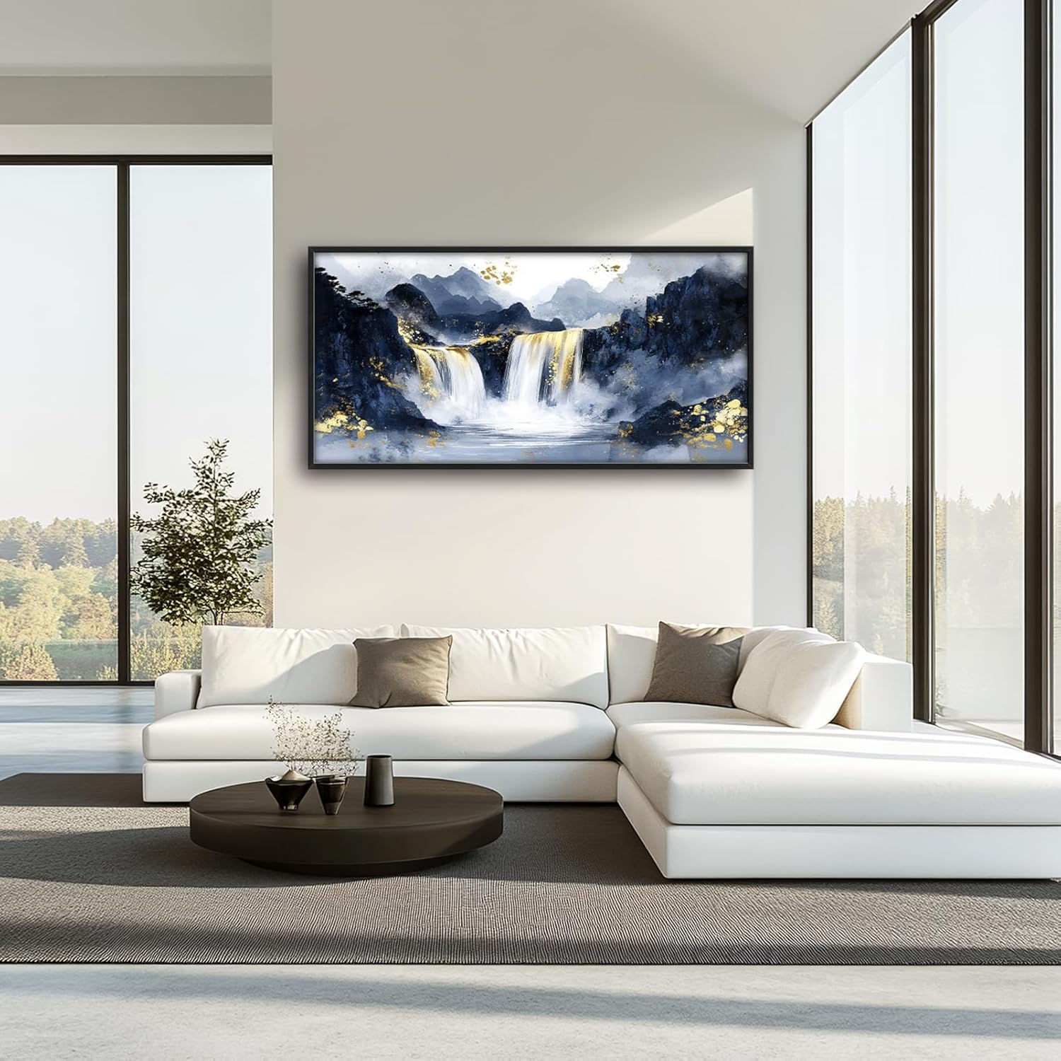 • 【Unique Design】 Waterfall, with gold foil embellishment, a blue and gray color scheme, and mountains in the distance. The waterfall flows down from the top left to the bottom right of the picture, with an ink splashing effect. The upper half of the canvas features white space, with additional ink splash effects.
