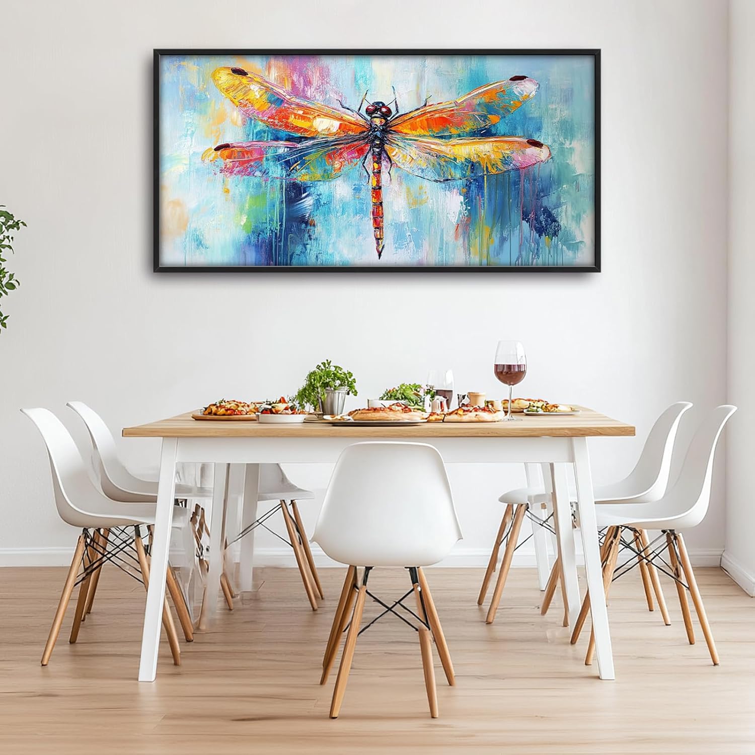 • 【Unique Design】 Colorful dragonfly painting, with vibrant colors and a colorful background, created using oil paint and detailed brush strokes. The large wings of the dragonfly are spread out, showcasing the bright colors.