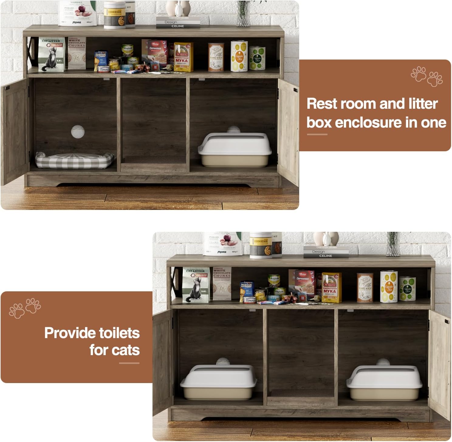 • Double Cabinet for 2 Cats: The 2 cabinets hold litter boxes or cat beds for 2 cats. Or both for one cat: one side for a litter box, the other for a cat bed. Our multi-functional cat box enclosure is designed with a spacious countertop and open storage compartment, perfect for storing pet food, toys and home decor.