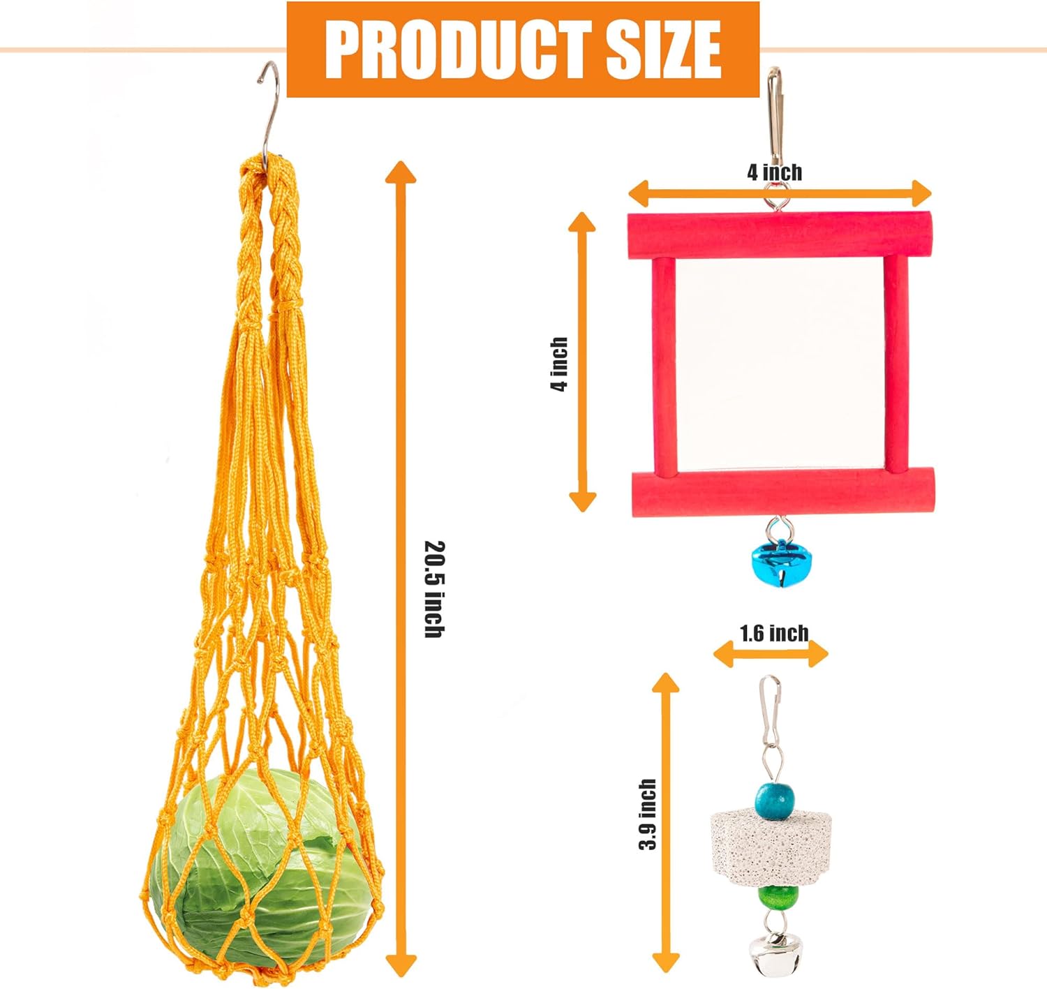 • 6 PCS Chicken Toys: This 6 pack chicken toys for coop include: 2 Chicken Mirror Toys, 2 hanging vegetable fruits nylon feeders and 2 beak grinding molar stones with jingle bell. Keep your chickens entertained with this variety pack designed for their natural behaviors.