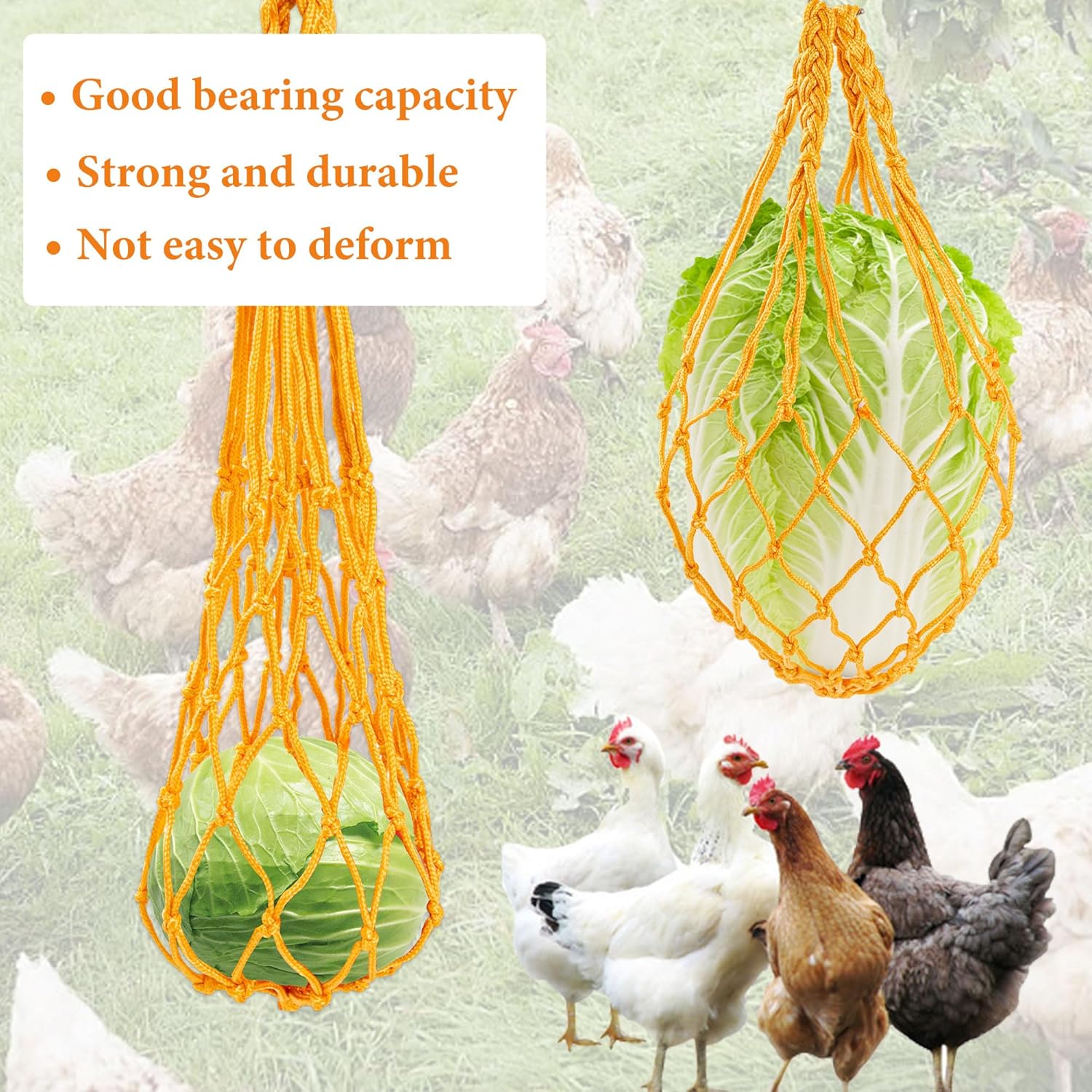• Hanging vegetable Feeder: Our heavy-duty nylon chicken feeders (20.5" long) make snack time fun! The mesh design holds veggies securely while encouraging natural foraging behavior. Easy to clean and helps maintain coop cleanliness between meals.