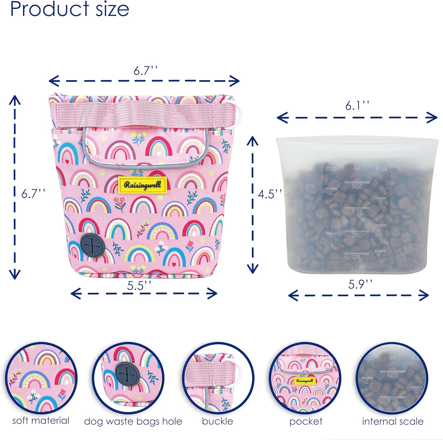 Dog Treat Pouch for Pet Walking and Training with Clicker 2 Cup Silicone Bag Small Fanny Pack Holder for Puppy Snack Dispenser Kit for Leash and Outdoor Use (Rainbow)