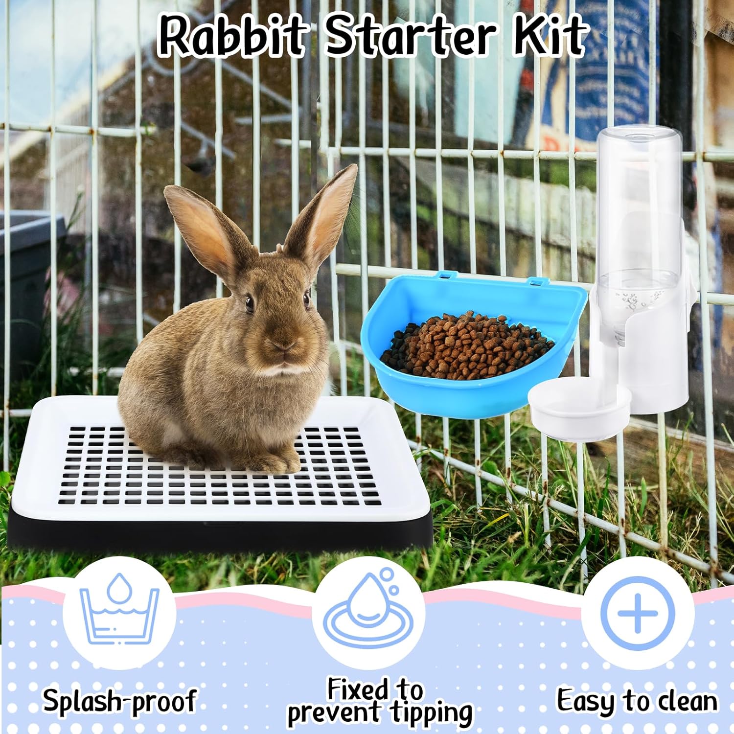 - Easy to Use: the water dispenser, hay feeder and bowl have knobs for fixing the cage, which can be firmly fixed to the cage to prevent sliding; The included replacement pad is for placing on the rabbit litter box, and the mini broom is for cleaning the litter box and cage