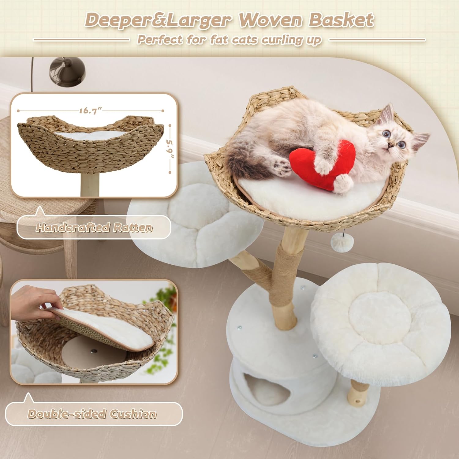 • Multiple Resting & Playing Spots: This cat climbing tower features a hand-woven natural cattail basket with a all-season mat at the top, plush surface and cool surface. It features 2 soft plush flower-shaped platforms for jumping and resting in the middle, plus a cozy private cat condo at the bottom. Two hanging pompoms encourage your little hunters to stretch, bat, and swat for endless entertainment.