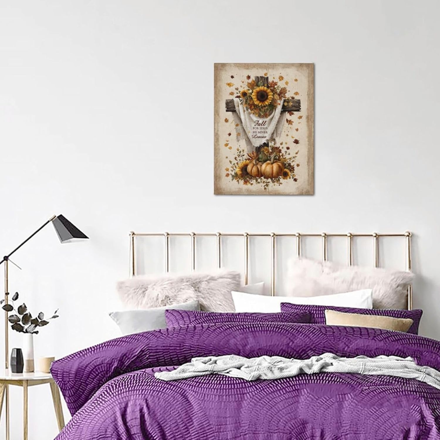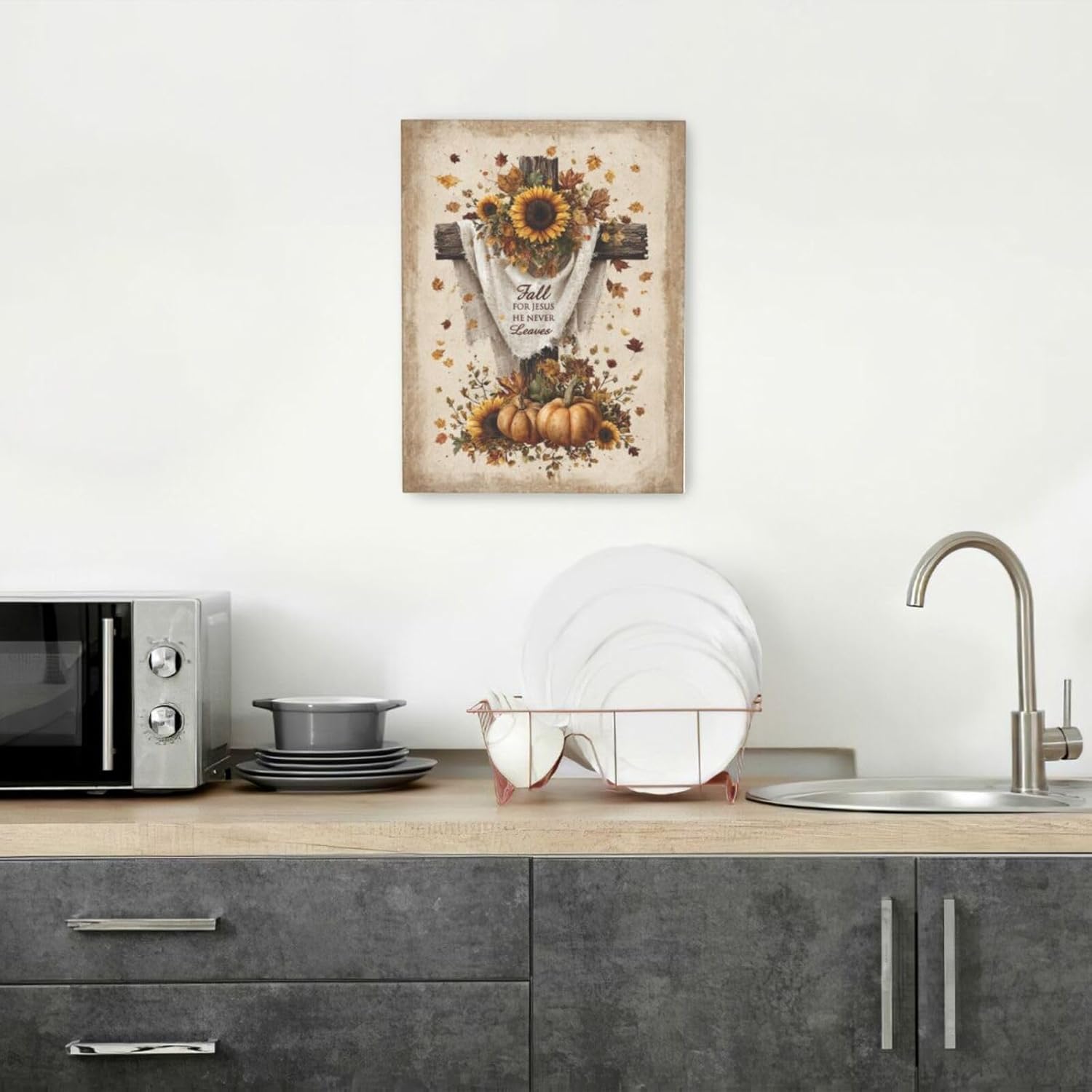 Christian Fall Wall Art Autumn Rustic Cross Sunflower Pumpkin Wall Decor Fall for Jesus He Never Leaves Pictures Painting Print Framed Artwork Decorations Gifts for Living Room Bedroom Prayer Room Office 12"x16"