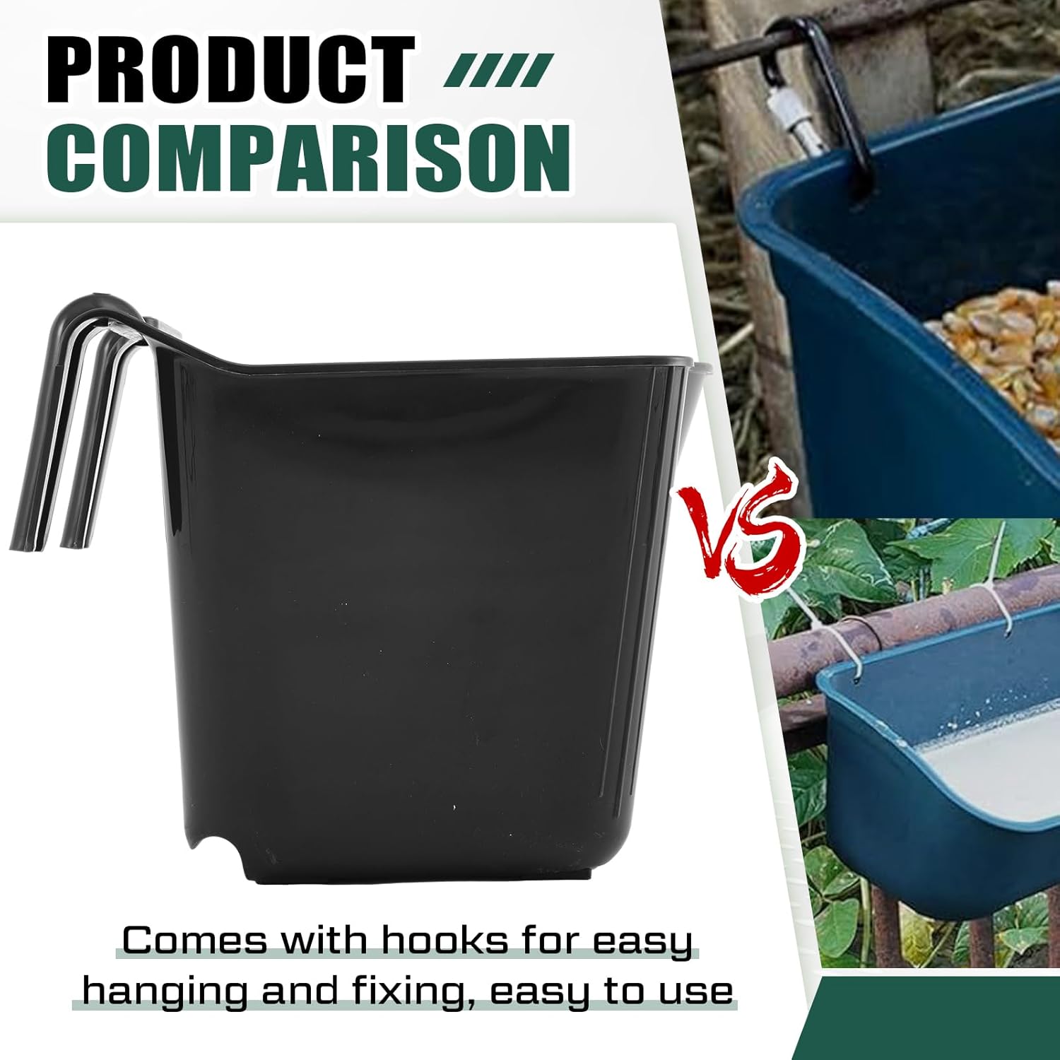 • Stackable: the 15 quart plastic hook feeder can be stacked for easy carrying or storage, and the plastic handle on the back of the plastic bucket also makes it easy for you to carry it in one hand