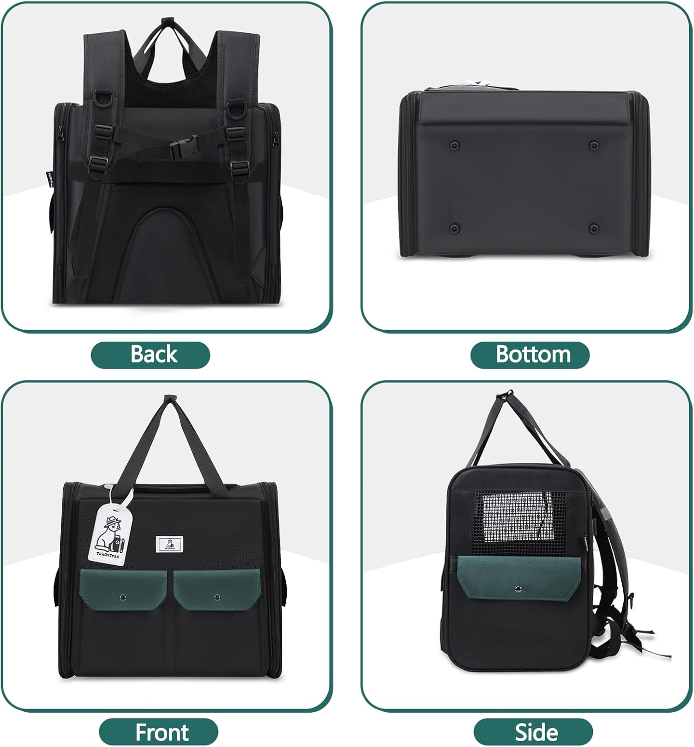 • Multiple ways to carry: This pet backpack can be carried by hand to ensure balance when carrying. It can also be carried on the shoulders. The sides and top can be opened for the owner to feed and pet. The front storage pocket can easily store snacks, toys, leashes, etc. Folding design for easy storage.