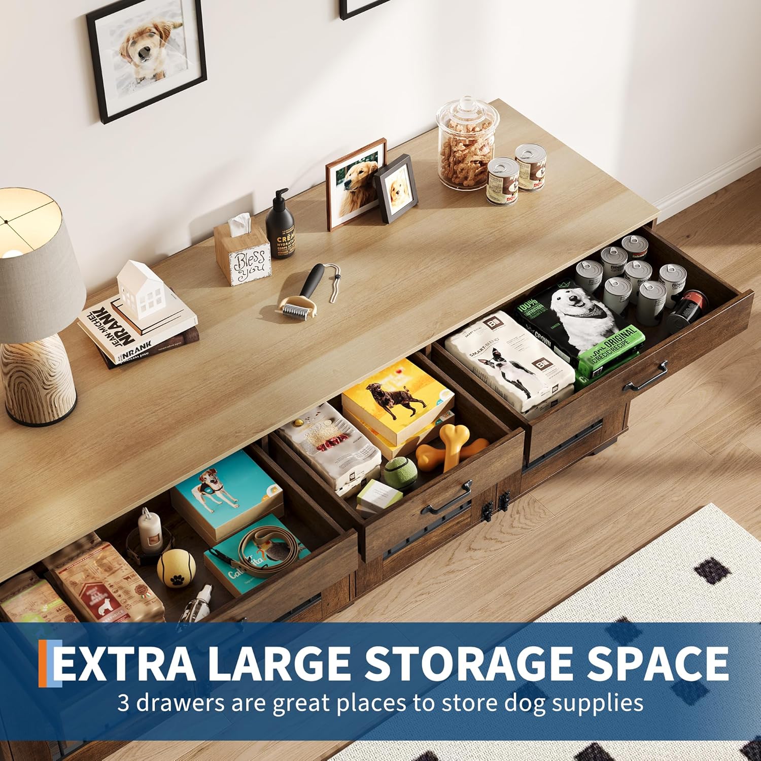 • Three-drawer smart storage: Three convenient drawers keep your home organized. Perfect for storing pet essentials such as pet toys, snacks and food, and even household items, helping you maintain a neat and organized space.