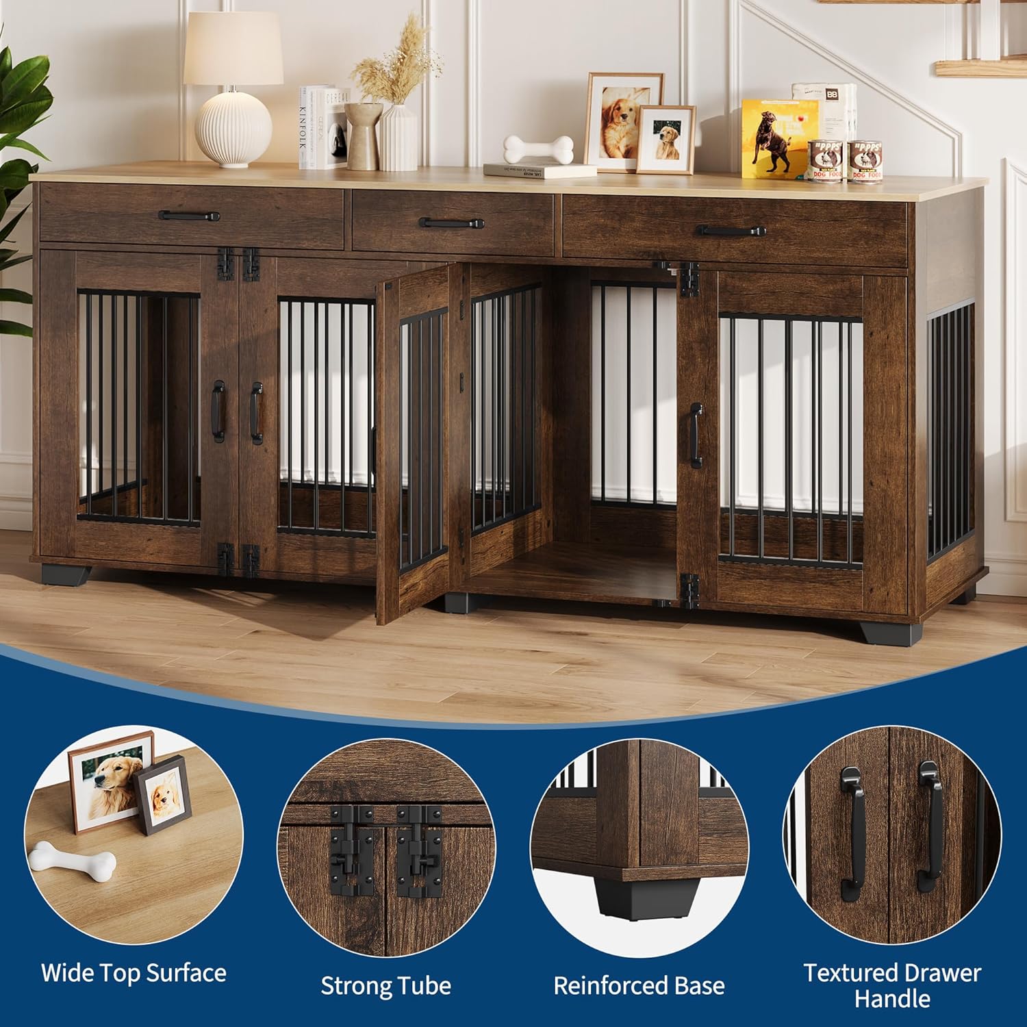• Stylish and Versatile Design: GarveeLife dog crate furniture features a classic design that blends in perfectly with any living space. It's more than just a pet crate, it doubles as a stylish TV stand or storage cabinet, adding practicality and elegance to your home