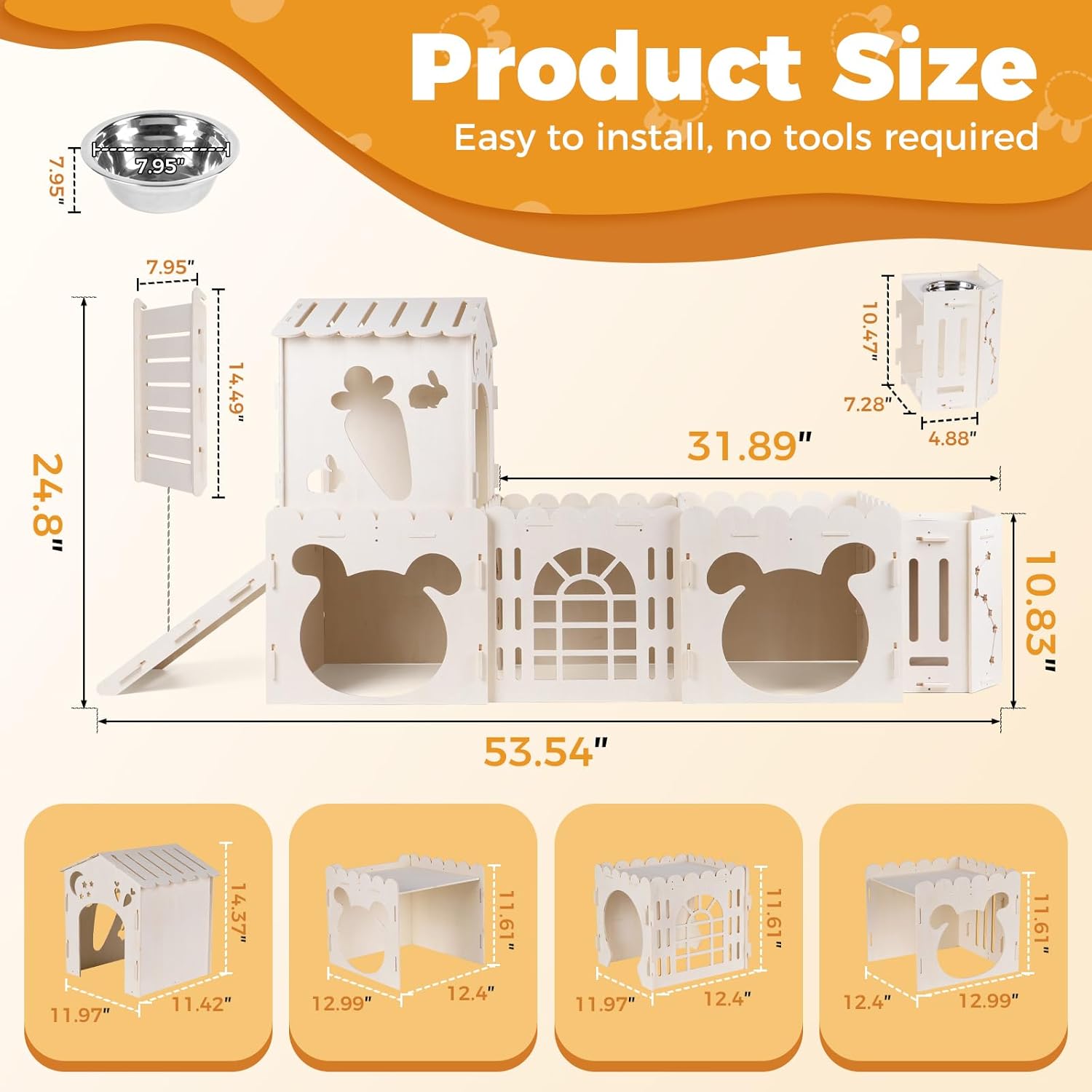 • 【3-in-1 Upgraded Rabbit House】Includes 4 interconnected bunny castles, 1 slide, 1 feeder, and 1 stainless steel bowl, offering rabbits a cozy space to rest, play, and dine—all in one fun habitat.