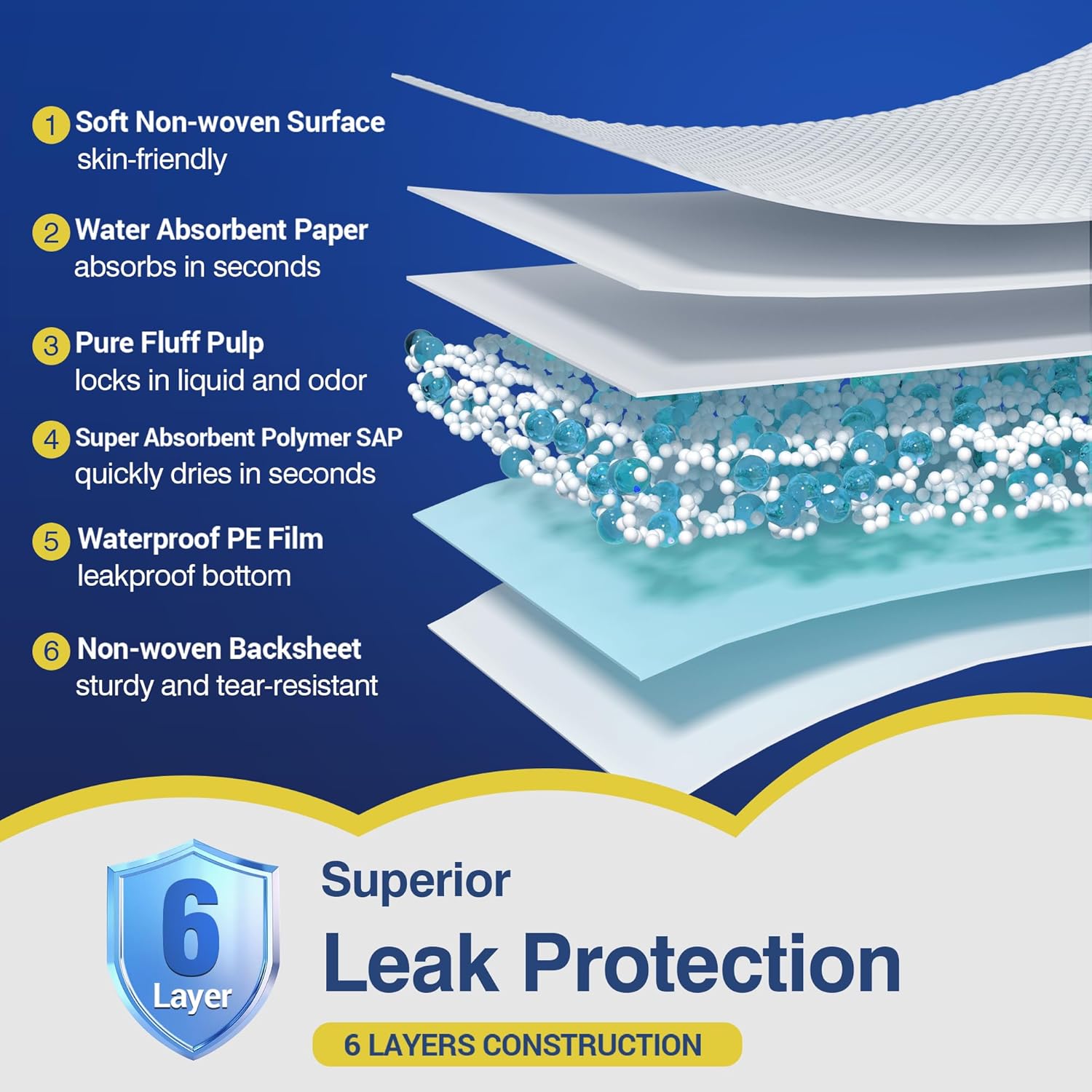 • Unmatched Leak Protection - Our 6-layer construction features a soft top sheet, super-absorbent core, and a waterproof backing. This powerful combination locks in moisture, preventing leaks from reaching your mattress, furniture, or wheelchair cushion. Enjoy peace of mind and a dry, protected surface throughout the night or day.