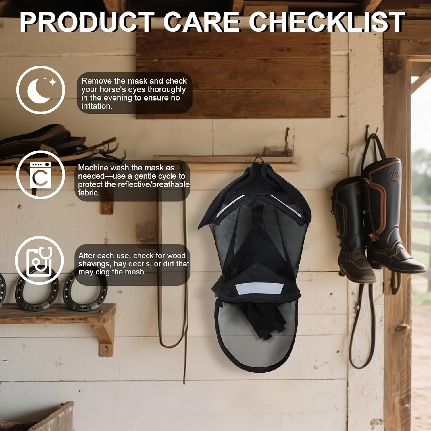 - 【High-Spec UV & All-Scenario Pest Defense】 Our lab-certified horse fly mask, an anti-fly mesh horse mask with UV protection, blocks 60%-90% of UV rays. This fly mask for horses shields light-skinned or blue-eyed horses from sunburn and infections. The dense micro-mesh of our fly mask covers face, eyes, ears, and nose, fending off horseflies, ticks, and pollen. Suitable for grazing to riding, our fly masks for horses with ears—including pony and mini horse options—ensure all-scenario protection.