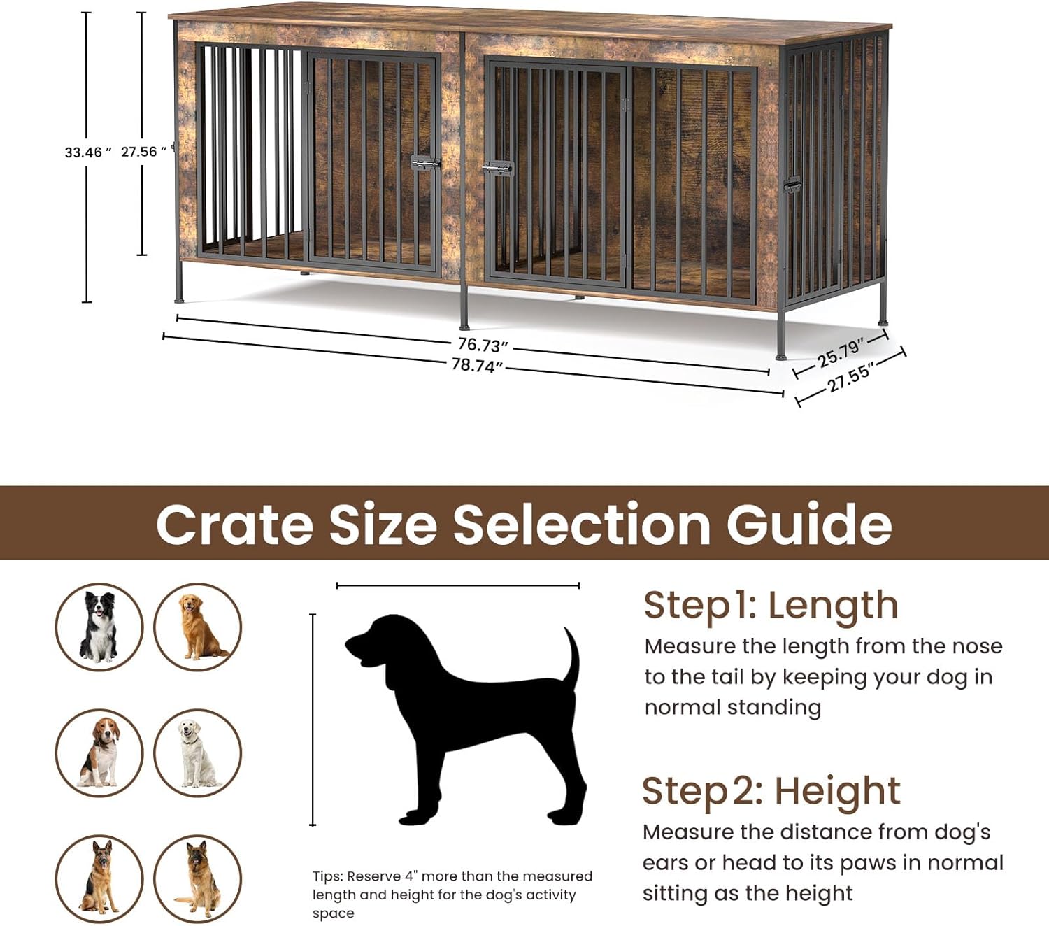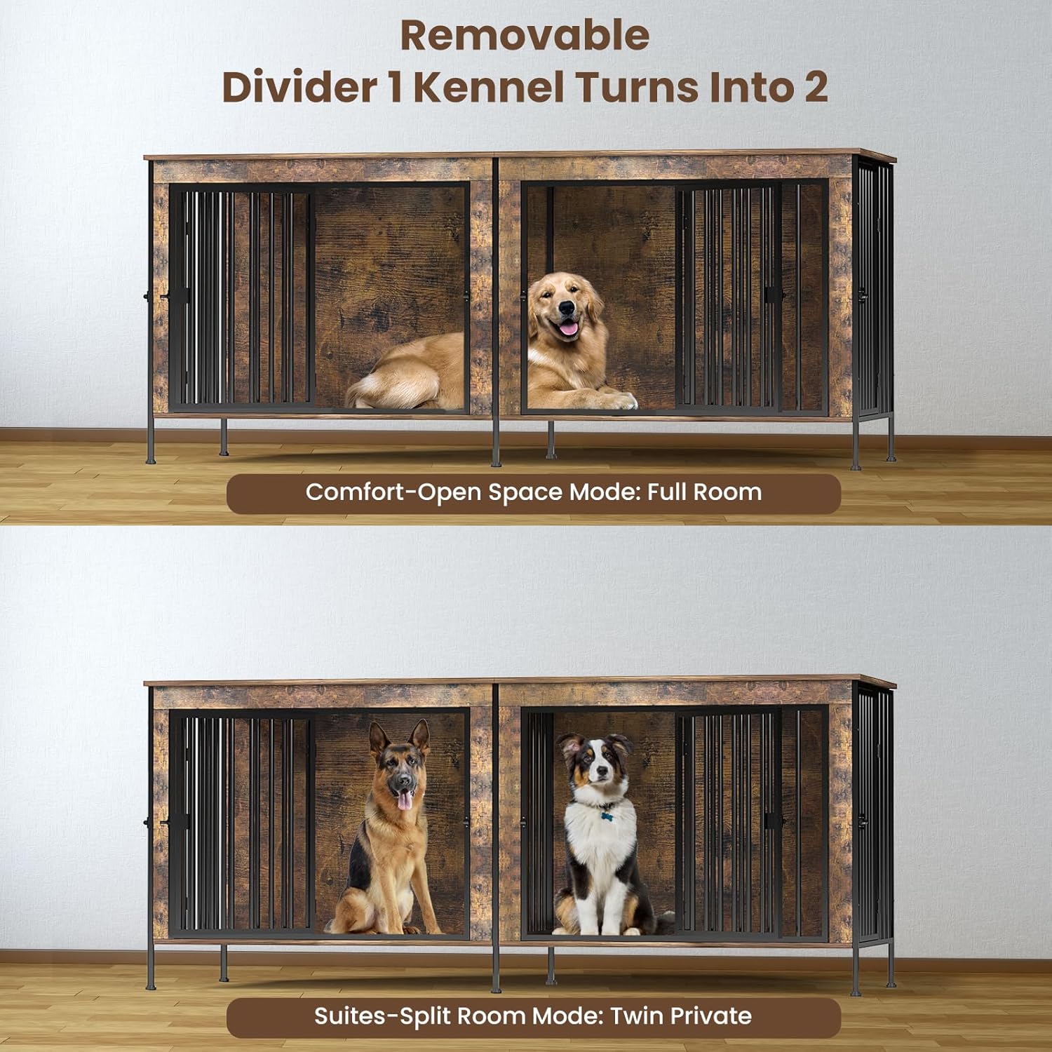 • Room for Two Large Dogs: At 78"L ร— 27.5"W ร— 33"H, this TimberAura dog crate furniture offers two roomy dens so Golden Retrievers or German Shepherds can lie flat and turn comfortably. The built-in center divider creates two separate dens, giving each dog its own space and helping reduce stress during feeding or rest.