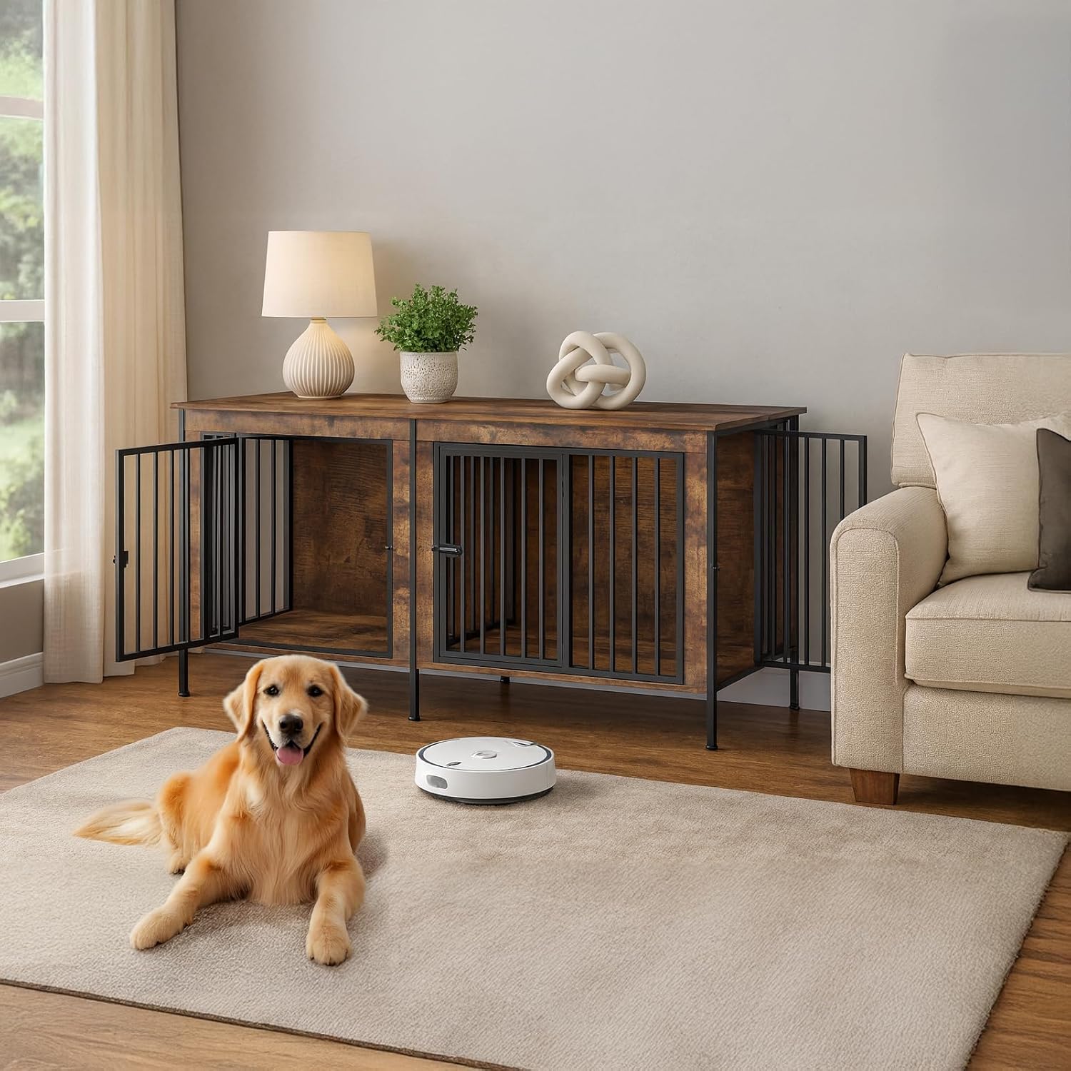 • Robot-Ready Raised Base: Four 3.9-inch legs lift the dog kennel furniture off the floor so most robot vacuums glide underneath, whisking away hair and crumbs without moving the crate. Airflow below keeps bedding dry and guards dogs from damp or cold floors.