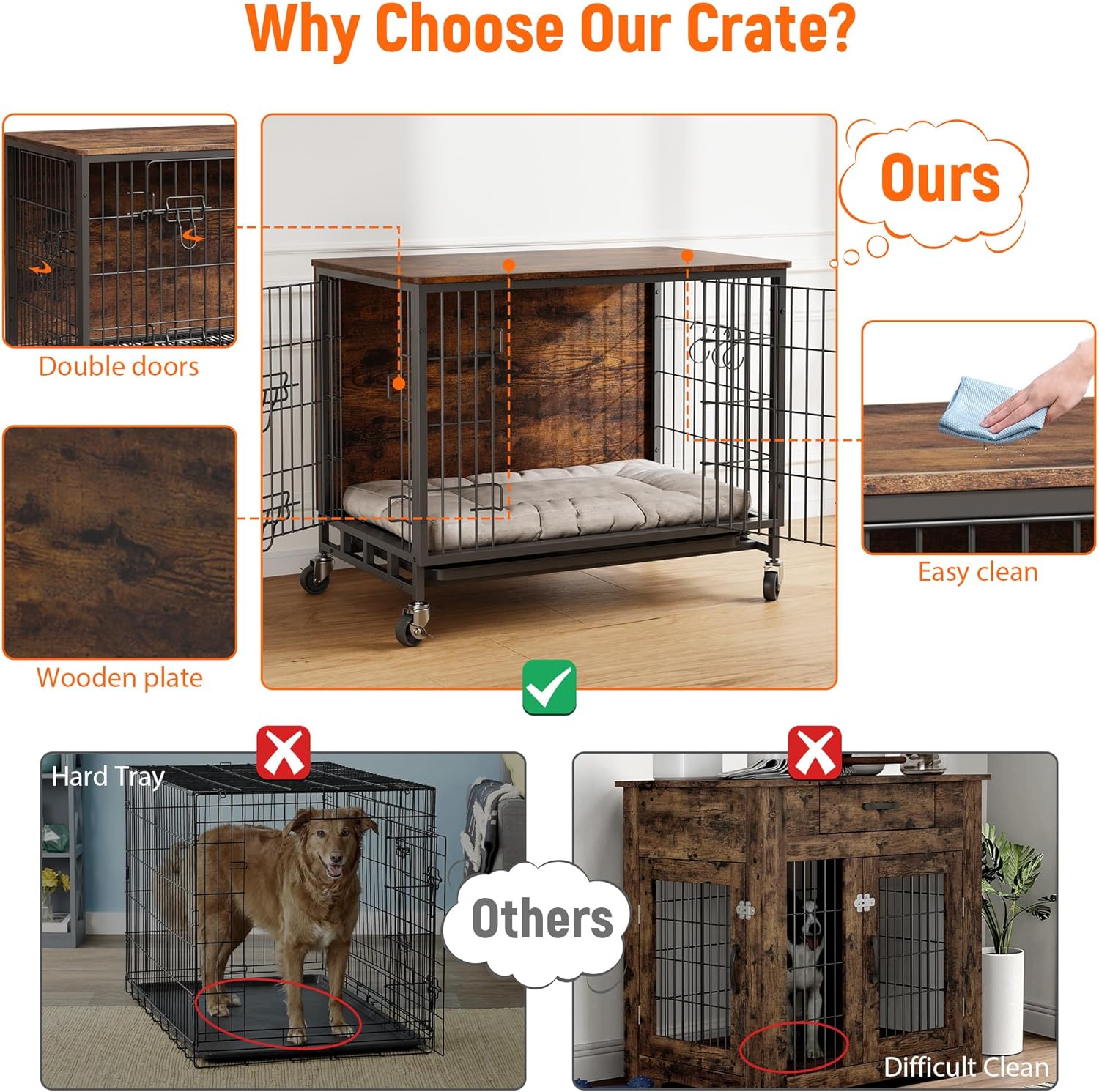• 3.Convenient Double Door Design: Experience ease with our double door setup, offering front and side access for simplified entry and cleaning. The side door can be customized to open on the left or right, allowing you to adapt the dog kennel perfectly to your home’s layout, thus enhancing its overall functionality.