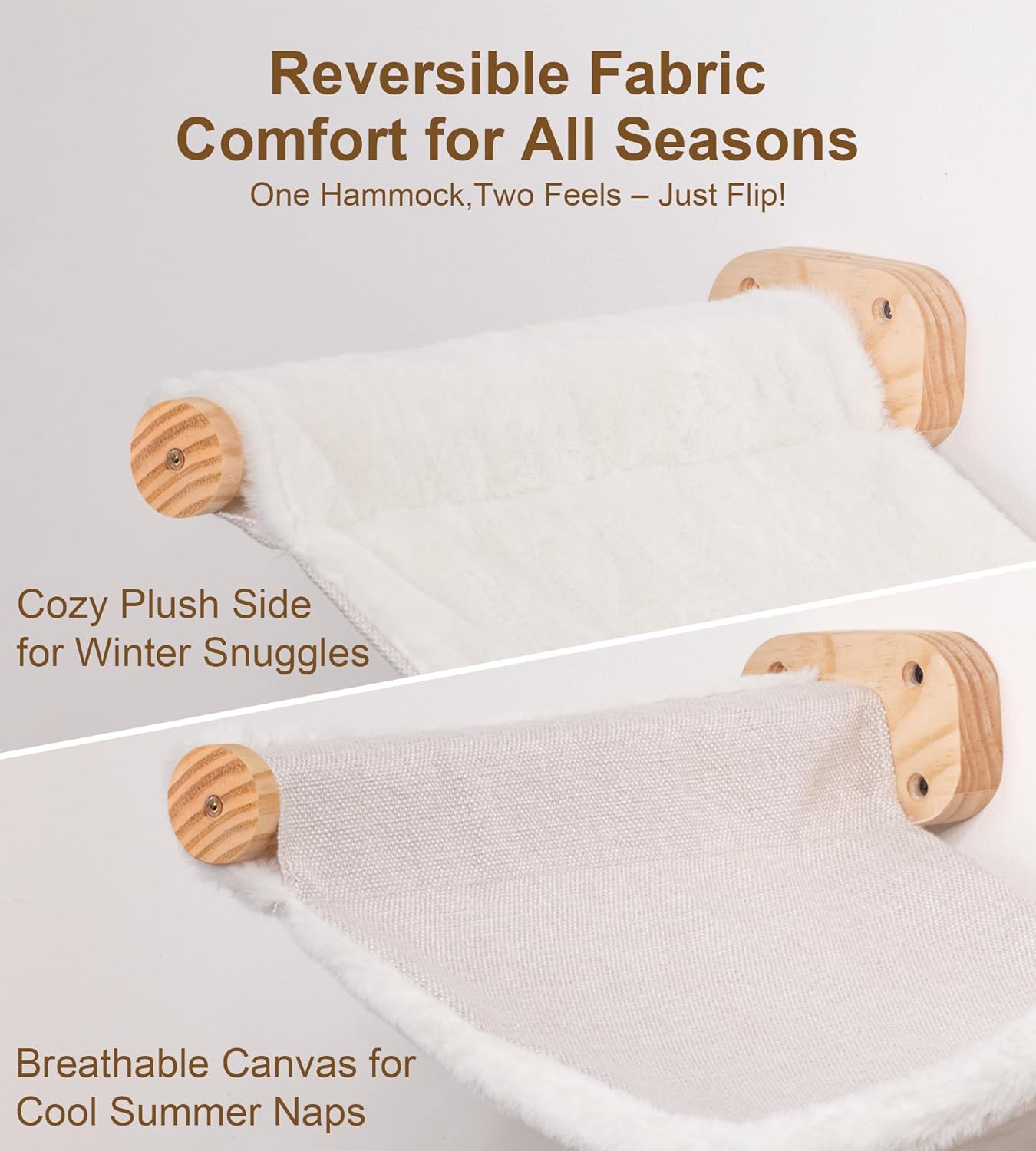 • Reversible & All-Season Cat Hammock: Dual-Sided Fabric for Year-Round Comfort; Our wall-mounted cat hammock features a reversible bed surface: breathable cotton canvas for spring and summer, and cozy plush fabric for fall and winter; Whether your cat loves to stay cool or snuggle up, this cat wall hammock delivers comfort in every season; Plus, the double-stitched edges ensure long-lasting durability.