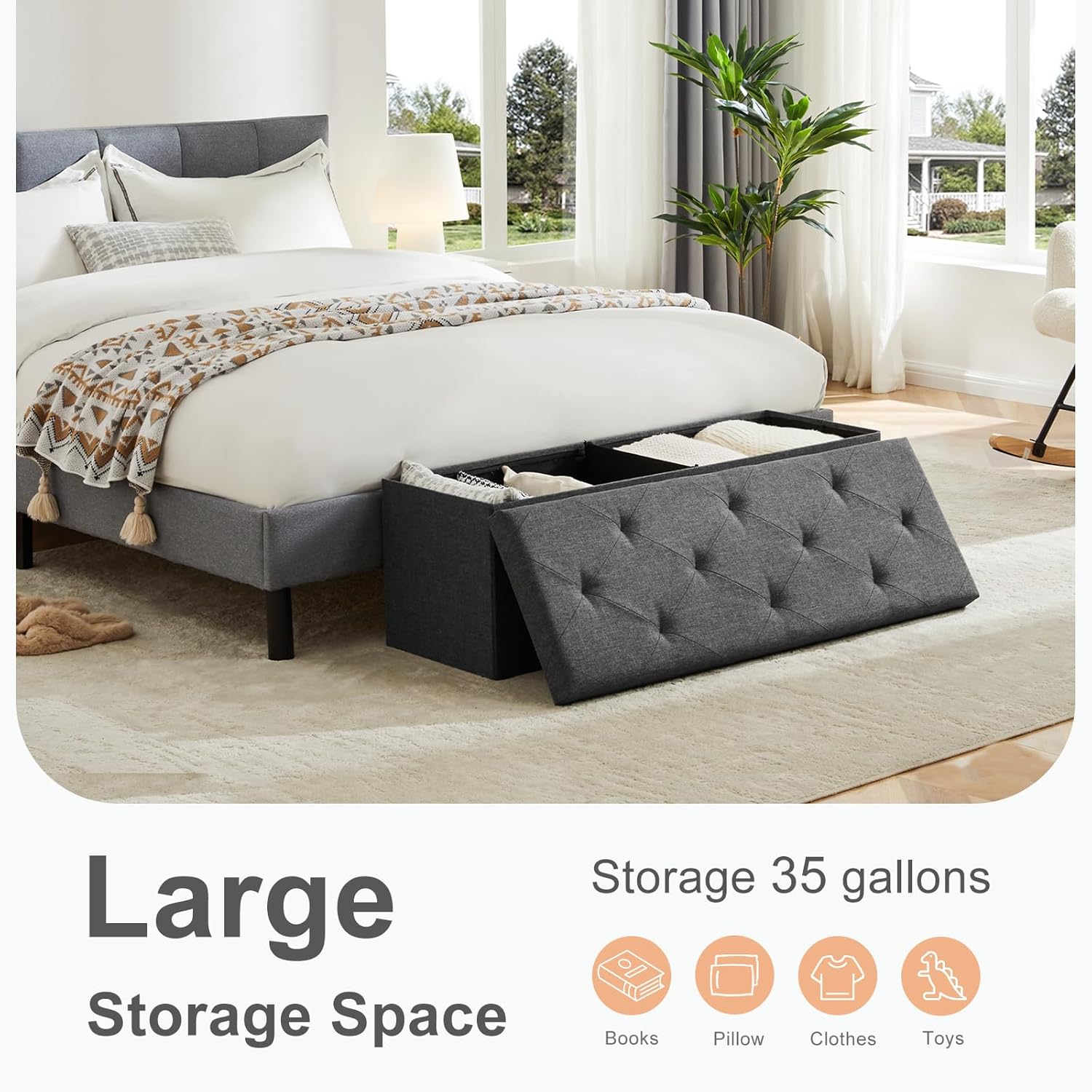 • ใ€Generous Storage Volumeใ€‘This storage ottoman, sized at 15"D x 15"H x 43"W, offers a substantial storage capacity of 35 gallons (154L). With the included center divider, you can segregate items on both sidesโ€”perfect for organizing bedding, clothing, toys, books, snacks, and more. The divider also enhances the top's structural support for added durability.