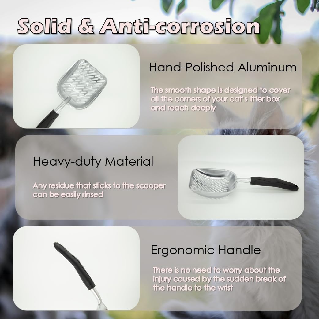 • HAND-POLISHED ALUMINUM - The bigger scoop lets you pick up more at one time & holes are big enough to sift the clean litter out easily. If you do have stuck clumps, the sharp edge & sturdiness of the scoop clean them right of the sides & bottom