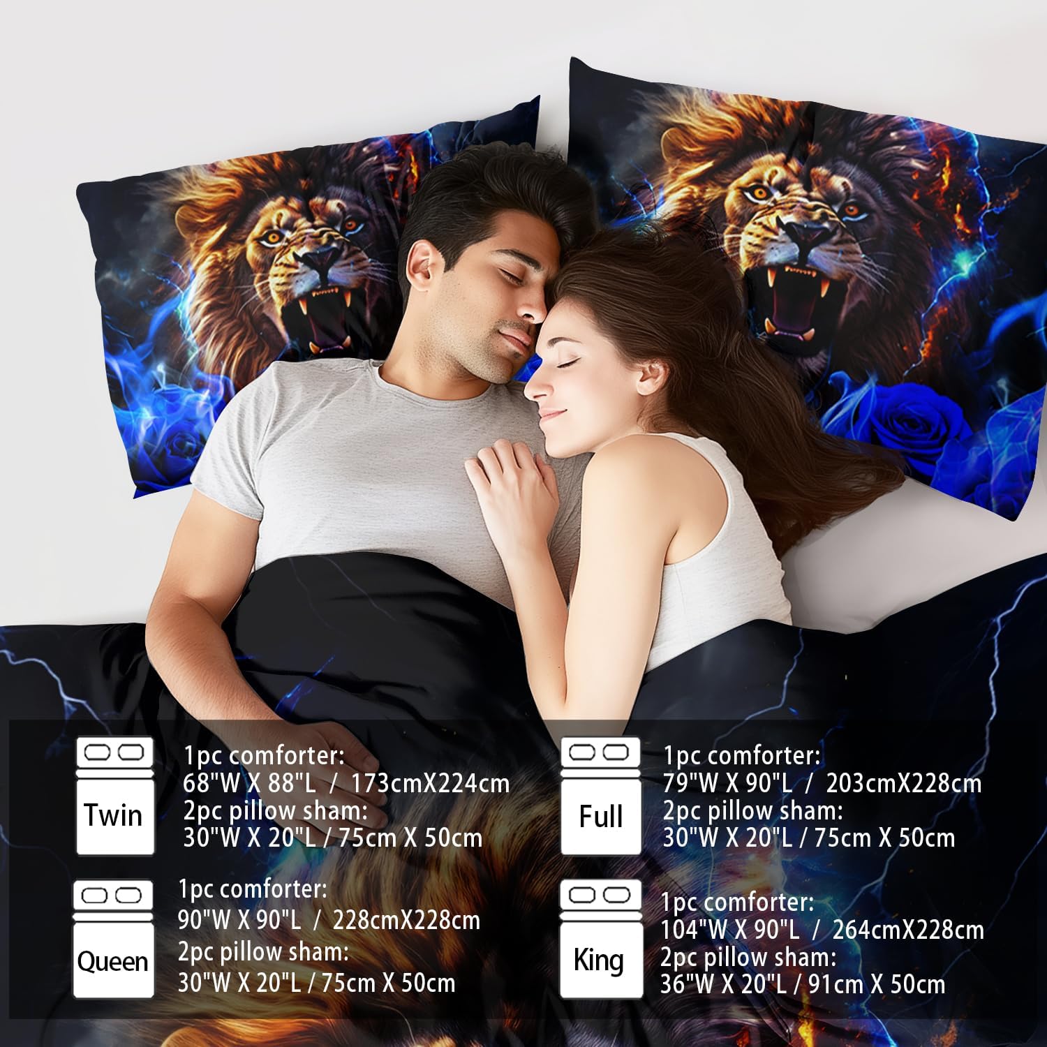 • King Size Fashion Lion Comforter Set :This bedding set includes 1 comforter(67" x 85") and 2 pillowcases(20”x30”). In order to facilitate transportation, the quilt is made of vacuum compression technology. It will be slightly wrinkled when taken apart, but it will quickly regain its fluffiness if you gently beat it.