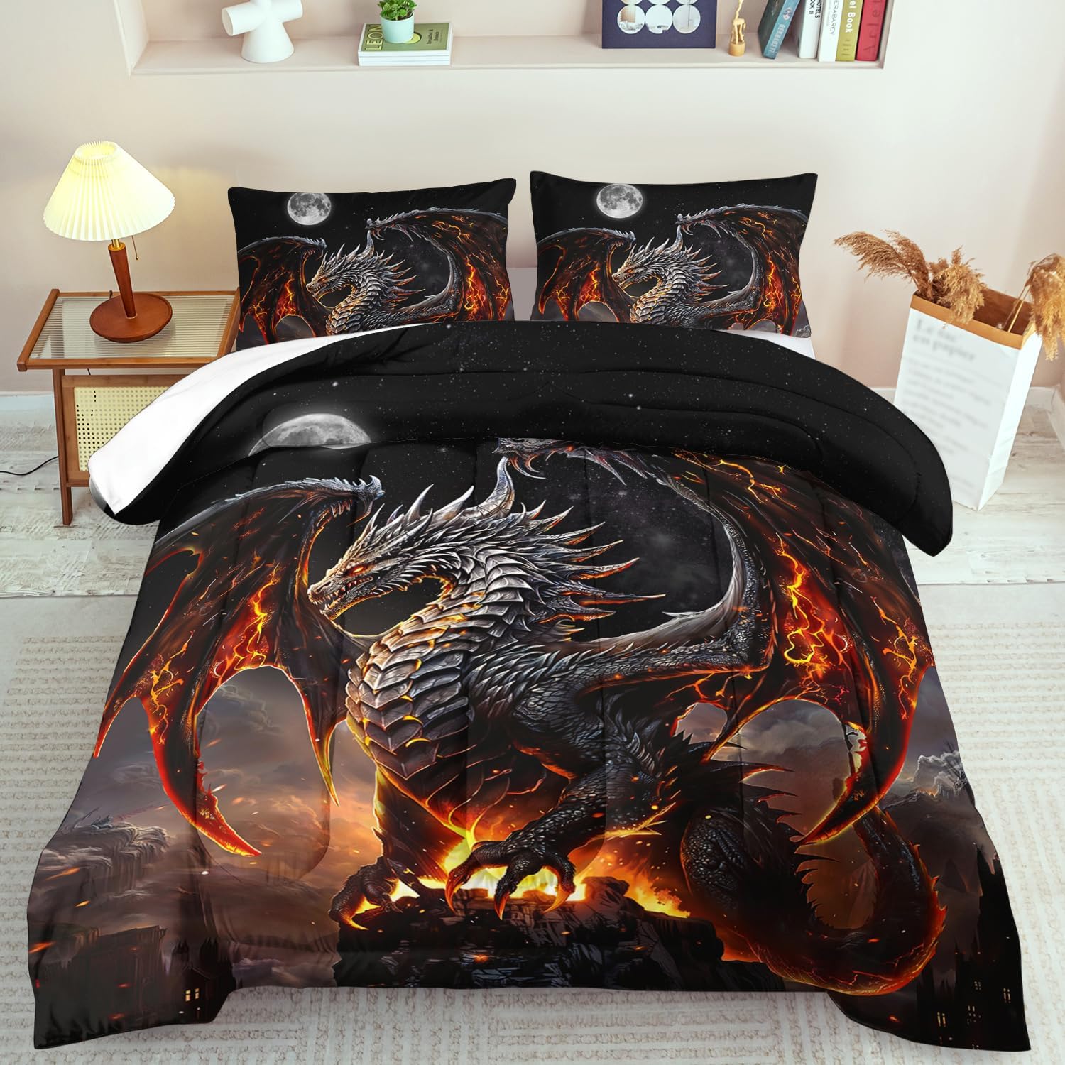 Black Dragon Comforter Set King Adult,Flame Dragon Bedding Set for Boys,Magical Beast Bedding Fantasy Animal Comforter Beedroom Decor,Magical Beast Quilt Bed Decor