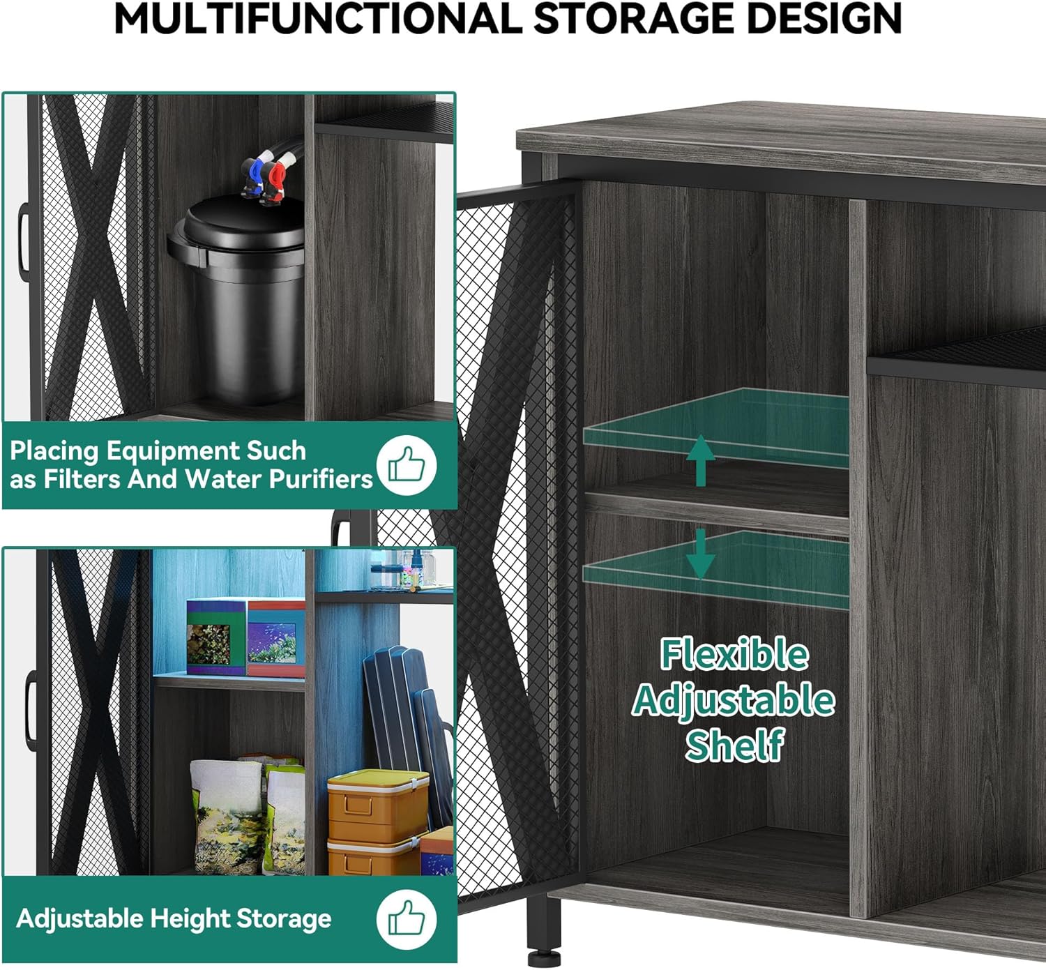 • Storage Efficiency: Maintain order with our fish tank with stand features for fish food, tools, and accessories. Adjustable shelves cater to items of all sizes, keeping your aquarium essentials in one place