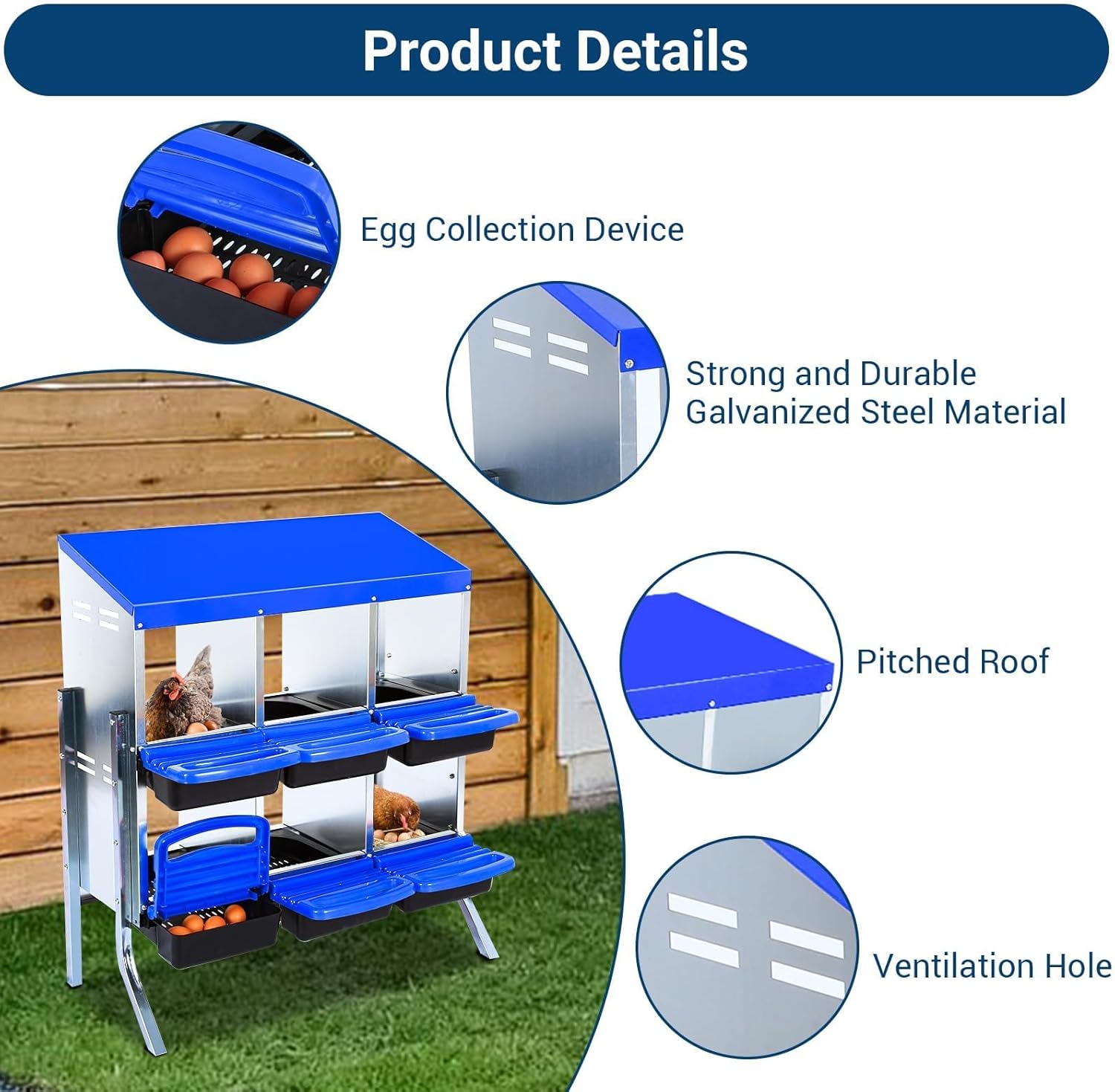 Chicken Nesting Boxes, 6 Hole Metal Chicken Laying Box with with Removable Trays and Roll Out Egg Collection for Chicken Coop, with Metal Bracket, Blue