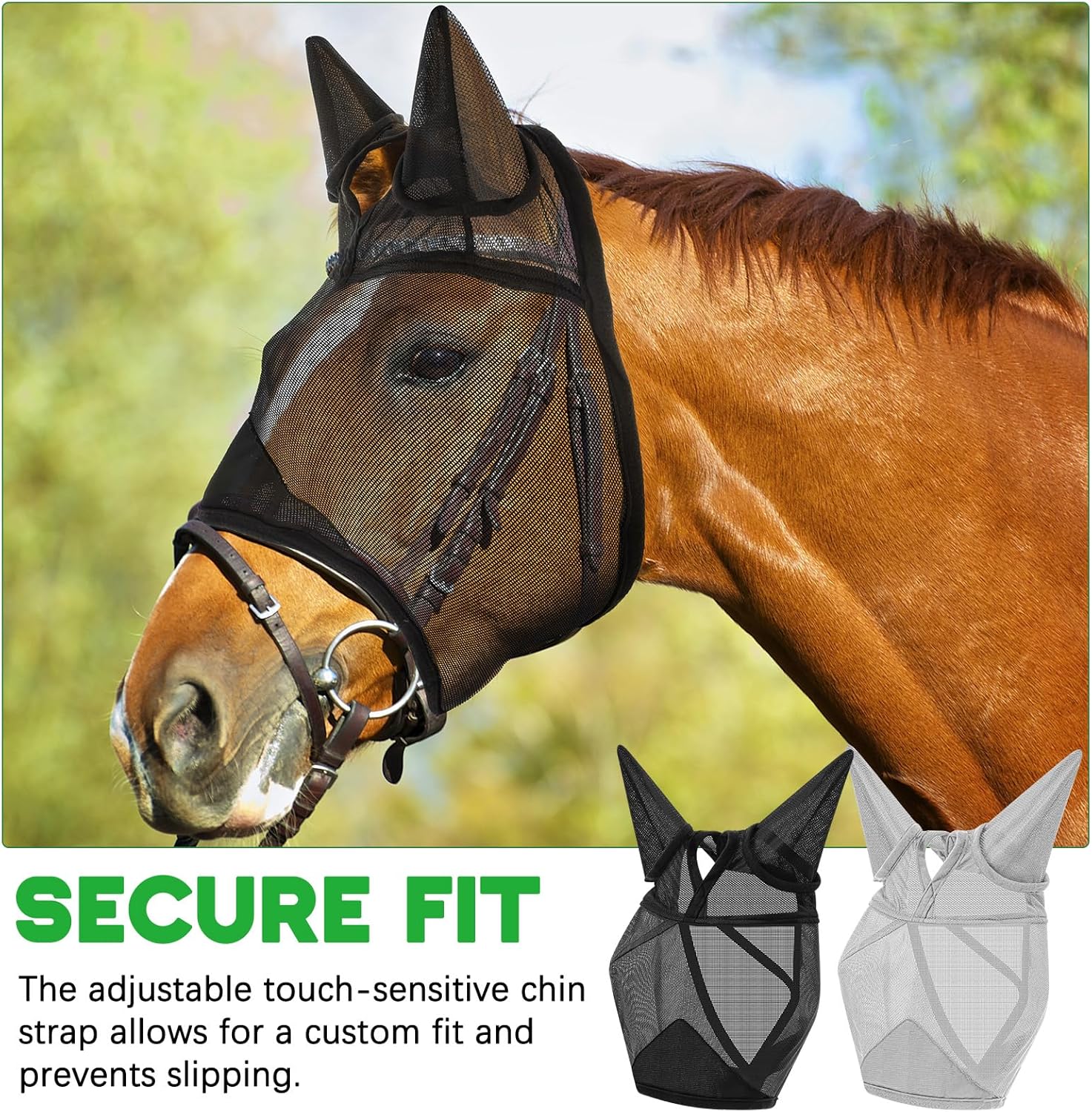 • Fit for Every Horse: finding the fit is a breeze with our adjustable size feature; This fly mask with ears for horses adapts seamlessly, offering optimal protection and comfort, ensuring a secure fit no matter the day's activity