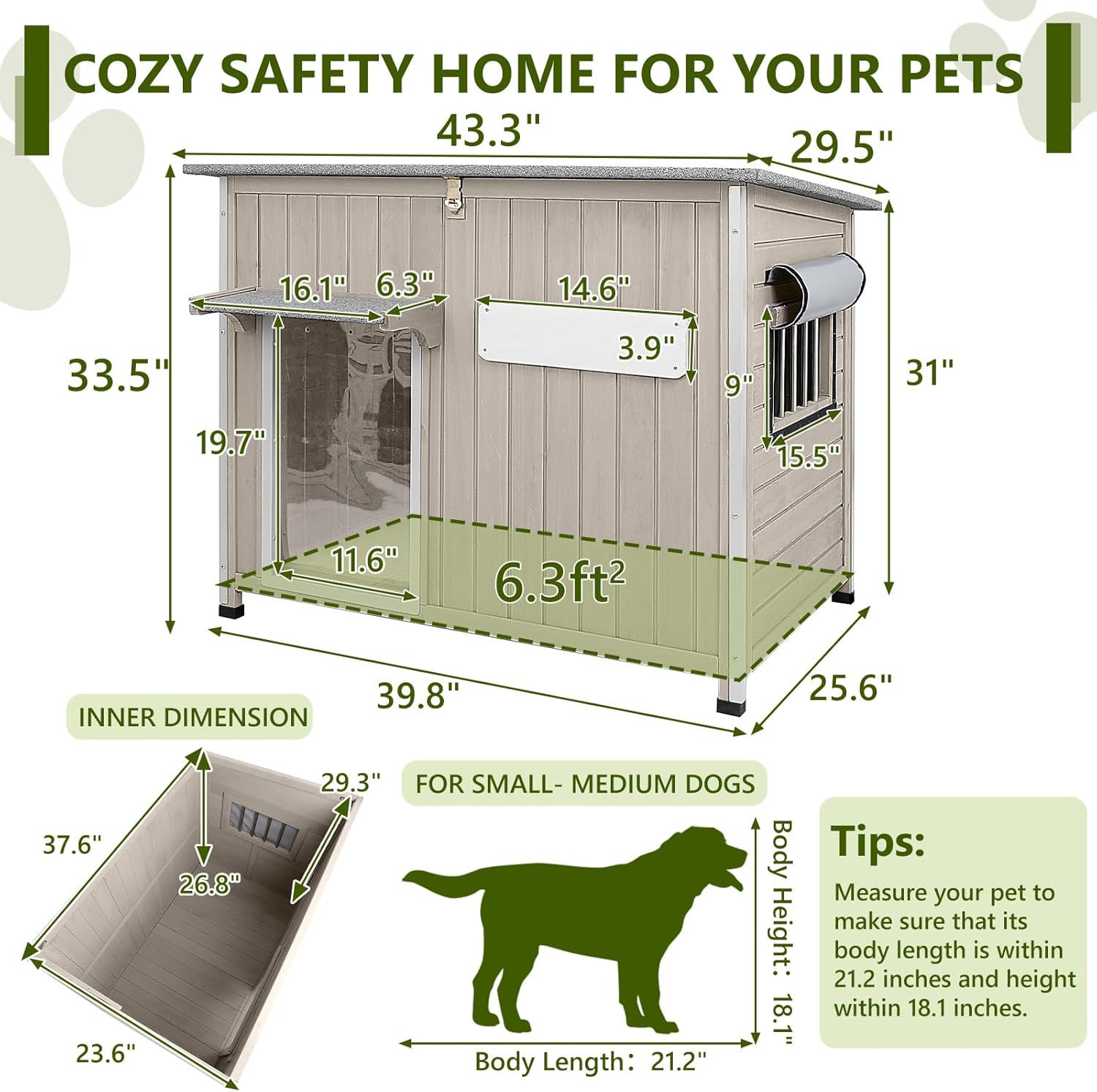 • 【SIZE & EASY ASSEMBLY】Overall Dimensions: 43.3"L x 29.5"W x 33.5"H, offering a spacious 6.3 sq. ft. interior for your pet to relax comfortably. Pre-drilled holes and detailed instructions make assembly fast and hassle-free, so you can provide your pet with a secure, cozy shelter in no time.