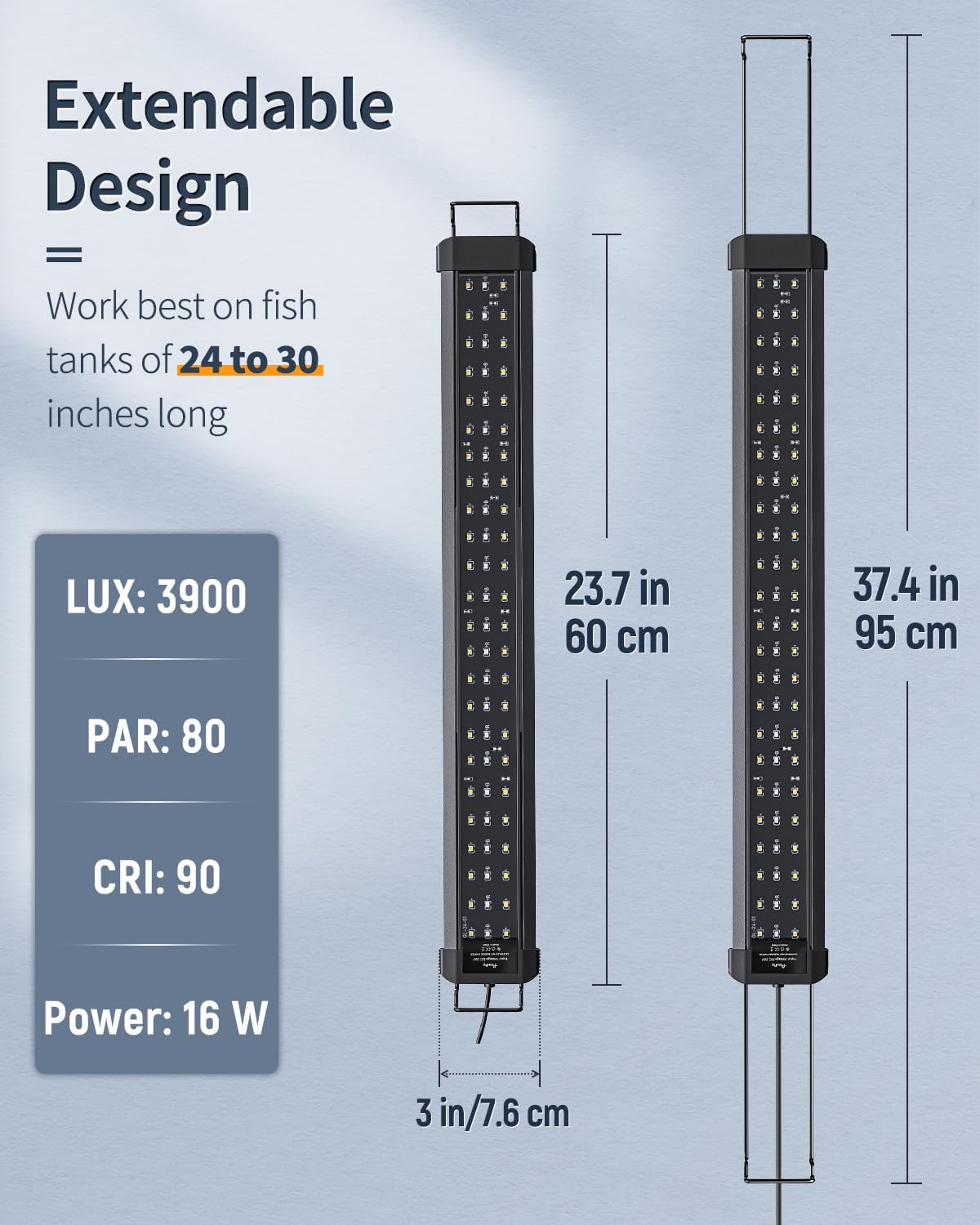 • For 24" to 30" Tanks: With an extendable bracket (min length: up to 24"; max length: up to 38"), the LED aquarium light always stays steady on the fish tank. Work best on tanks of 24 to 30 inches long.