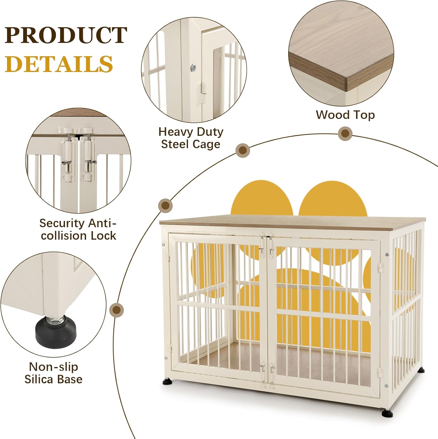 • Sturdy and Chew-Resistant: The design of the thickened metal fence can effectively prevent dogs from chewing, increase the firmness and not easy to deform. The large dog crate combines heavy-duty wood panels and metal to ensure sturdy and stable for long-term use. The top provides extra storage space for pet supplies and other decorative items. The top supports a maximum weight of 200 lbs