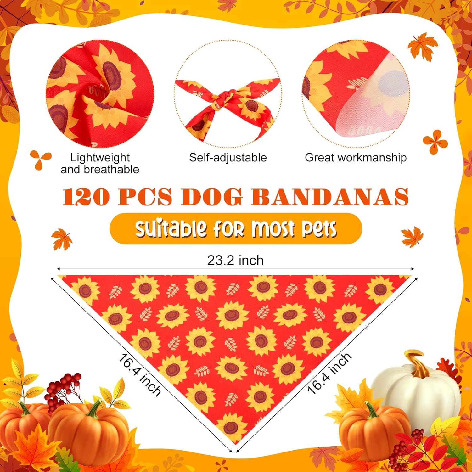 • Adjustable Size for Most Pets: Each fall dog scarf measures 23.2 x 16.4 x 16.4 inches (58 x 41 x 41 cm), fitting small medium and large dogs and cats. Easily fold to suit smaller pets; lightweight fabric ensures comfort