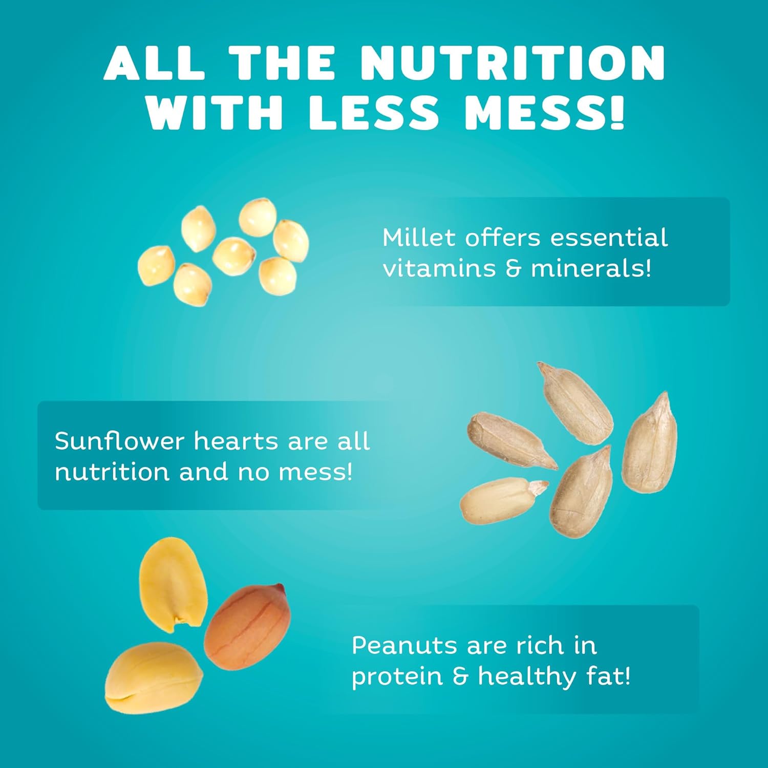 • No Mess Formula – Shell-free blend with sunflower hearts, chips, and peanut pieces helps keep feeding areas clean