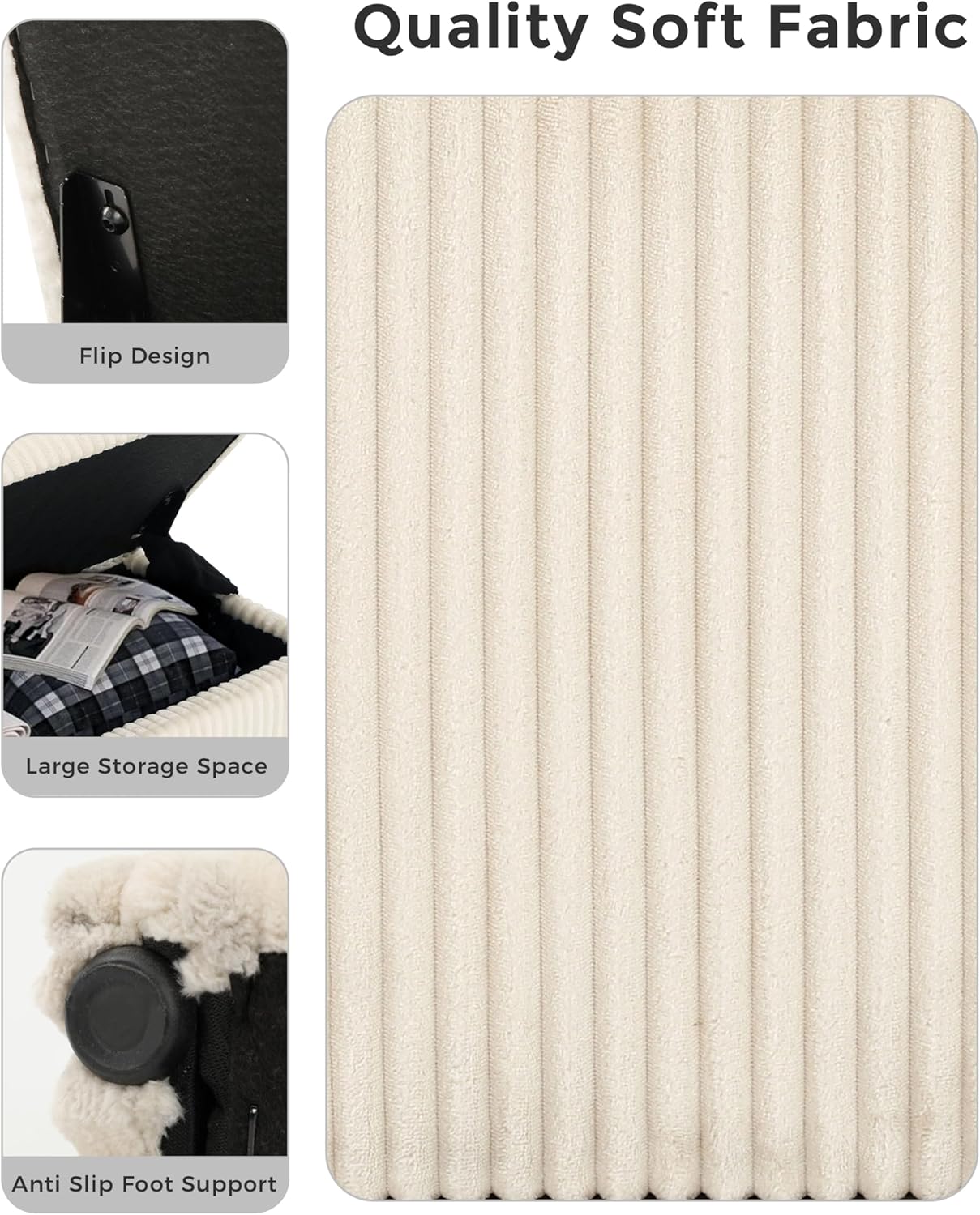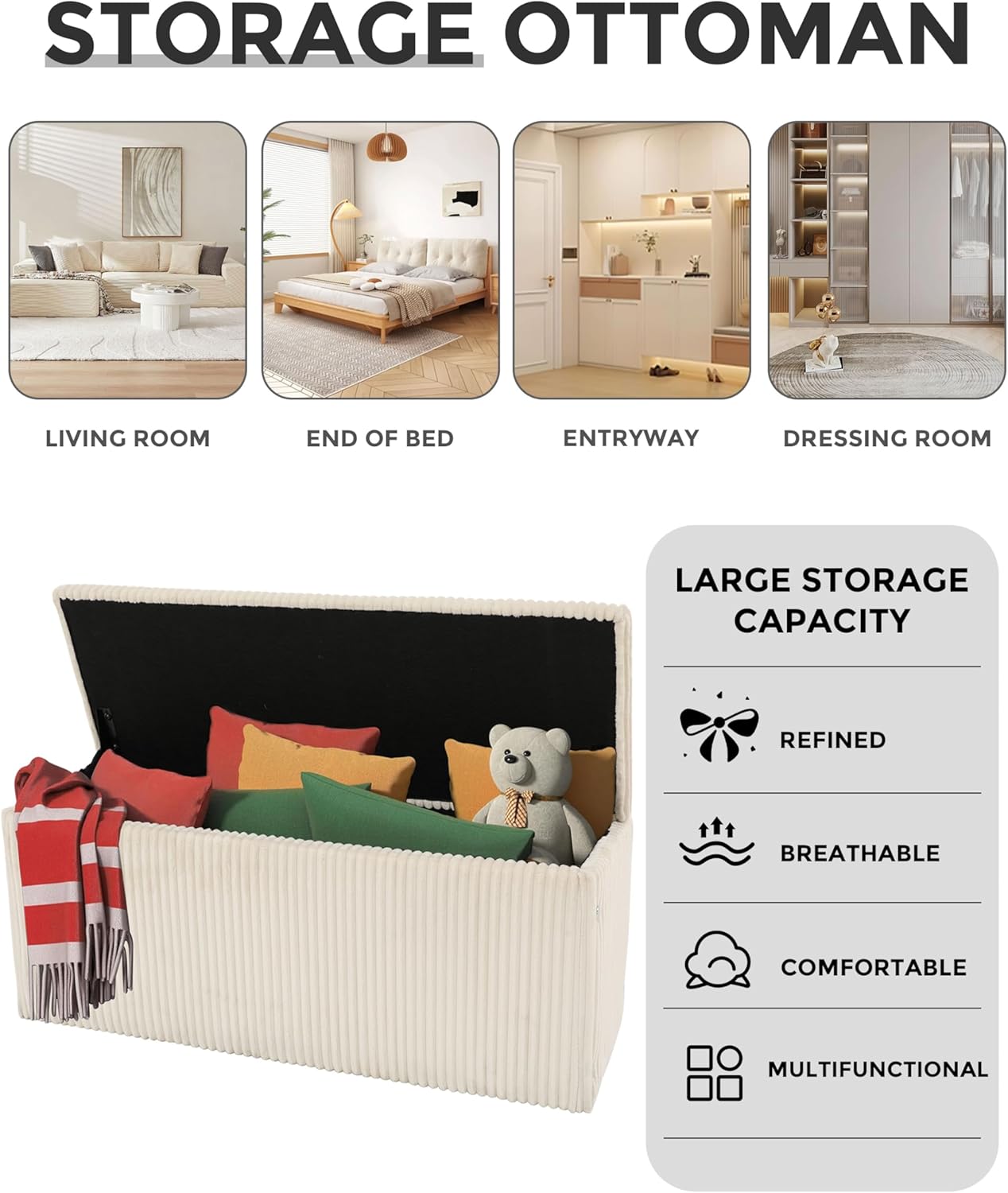 • 𝐌𝐔𝐋𝐓𝐈𝐅𝐔𝐍𝐂𝐓𝐈𝐎𝐍𝐀𝐋 𝐅𝐎𝐑 𝐀𝐍𝐘 𝐑𝐎𝐎𝐌: Use our ottoman bench as a footrest in the living room, a window seat in the bedroom, a shoe bench at the entryway, or toy storage in the playroom. This storage ottoman bench adapts to any space — ideal for apartments, dorms, RVs, and large family homes alike.