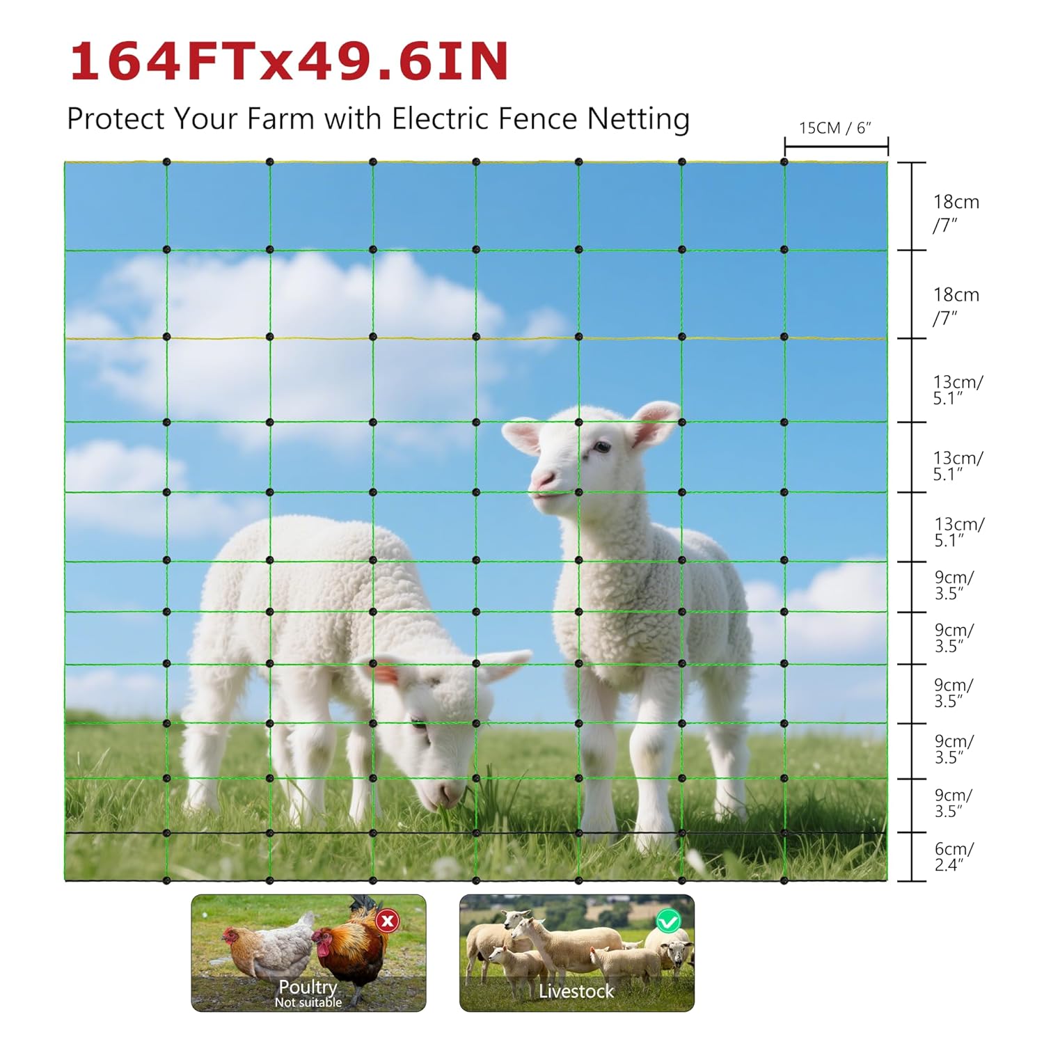 Electric Fence Netting, 49.6" H x 164'L, Electric Poultry Fence, Net Fencing Kit, Movable Livestock Nets for Yard,Backyards,Farms,Ranches, Energizer Not Included