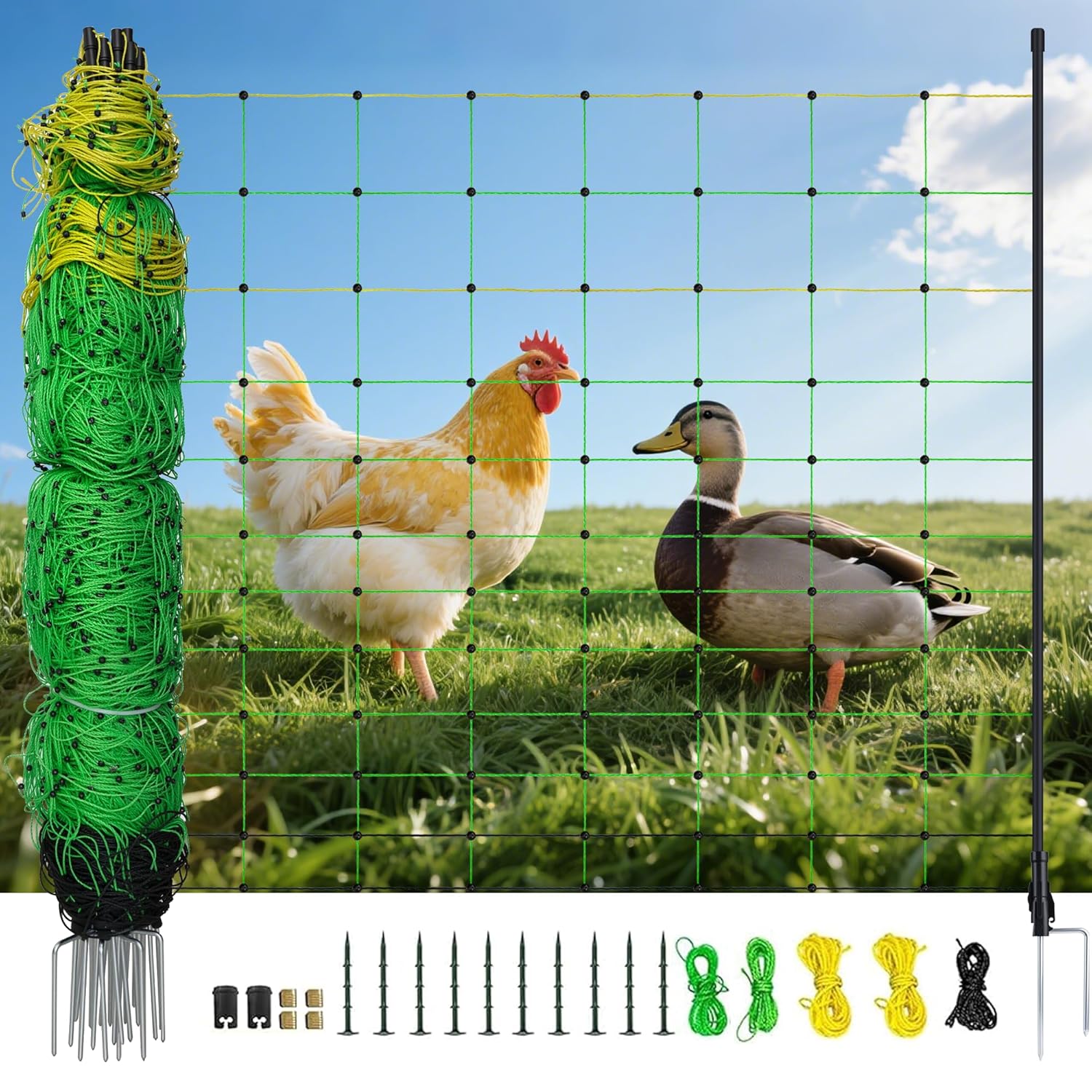 • High-Quality Construction: 49.6" H x 164'L Our Electric Fence Netting is crafted from durable PE material and stainless steel mesh, ensuring superior longevity and performance. With 14 pre-assembled fiberglass posts and double-point steel stakes, you can trust in its strength for long-term use.
