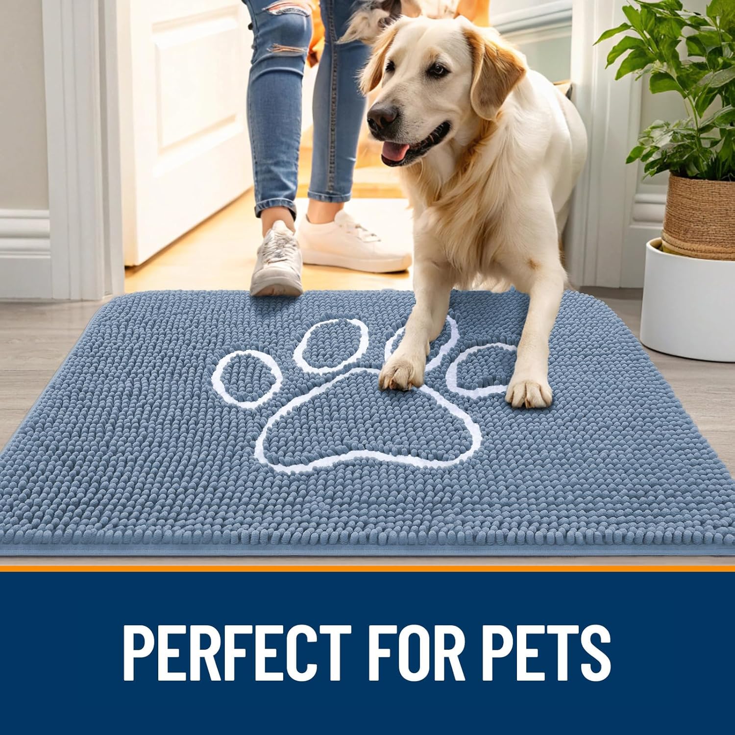 OLANLY Door Mat for Muddy Dog Paws 30x20, Absorbent Chenille Doormat with Paw Print Design, Non-Slip Washable Doormat for Indoor Entryway, Quick-Dry Pet Bed Mats for Dirty Dogs, Airy Blue and White