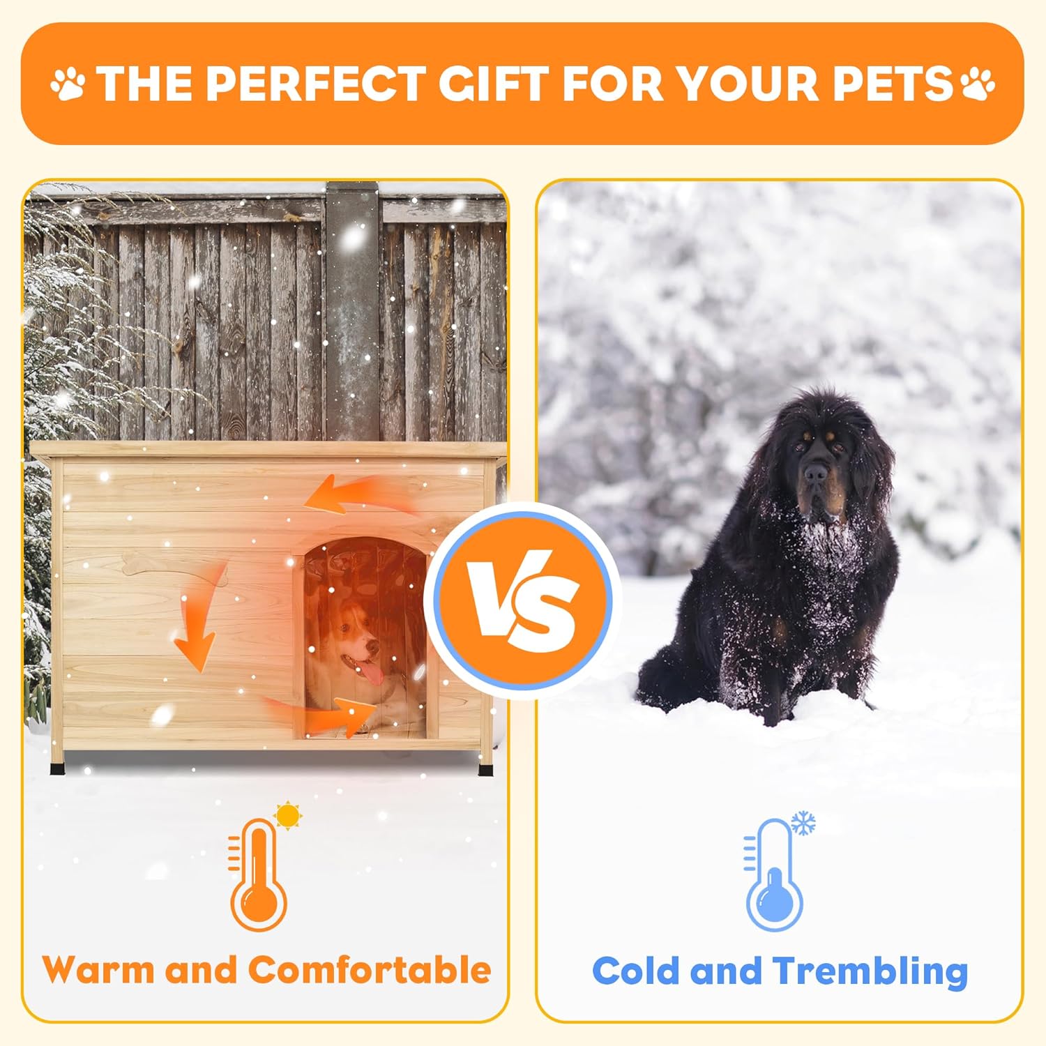 • [Specially Designed for Outdoor Use] The sloping asphalt roof is expertly engineered to prevent rainwater from pooling, ensuring that your pet's living space remains dry and comfortable. The floor is 2.4’’ above the ground, and there is a removable PVC curtain and adaptable floor pads for uneven ground. This design enables the dog house to withstand harsh weather conditions, preventing water from seeping in and materials from getting damp