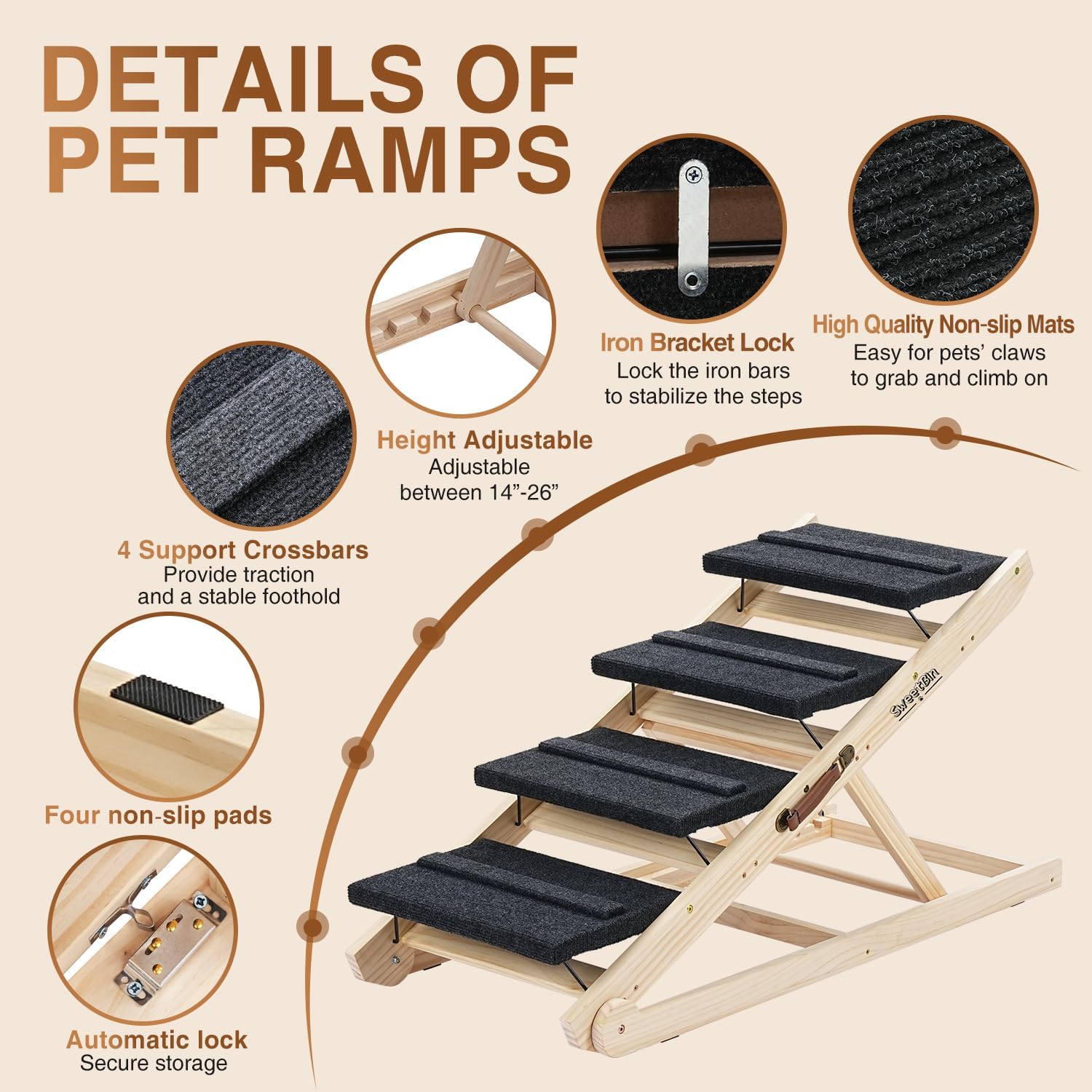 • ✅ANTI-SLIP SAFETY FEATURES - Our wooden dog ramps are thoughtfully crafted to alleviate muscle and joint strain. The non-slip fabric cover provides traction for pets' paws, with 4 anti-slip crossbars preventing sliding on inclines. Designed with bottom anti-slip pads, our pet steps offer protection for your floors.