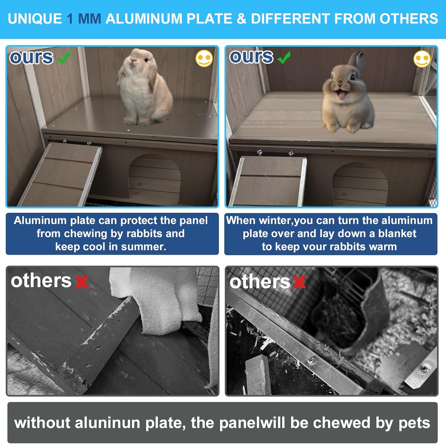 • 【Reversible Cooling Panel】The bunny house features a reversible cooling panel to ensure your pets' comfort during hot weather. It can be flipped to provide extra insulation during colder months. The secure, lockable door on these guinea pig and bunny cages ensures your pets' safety at all times. Easily accessible for all your pet housing needs.