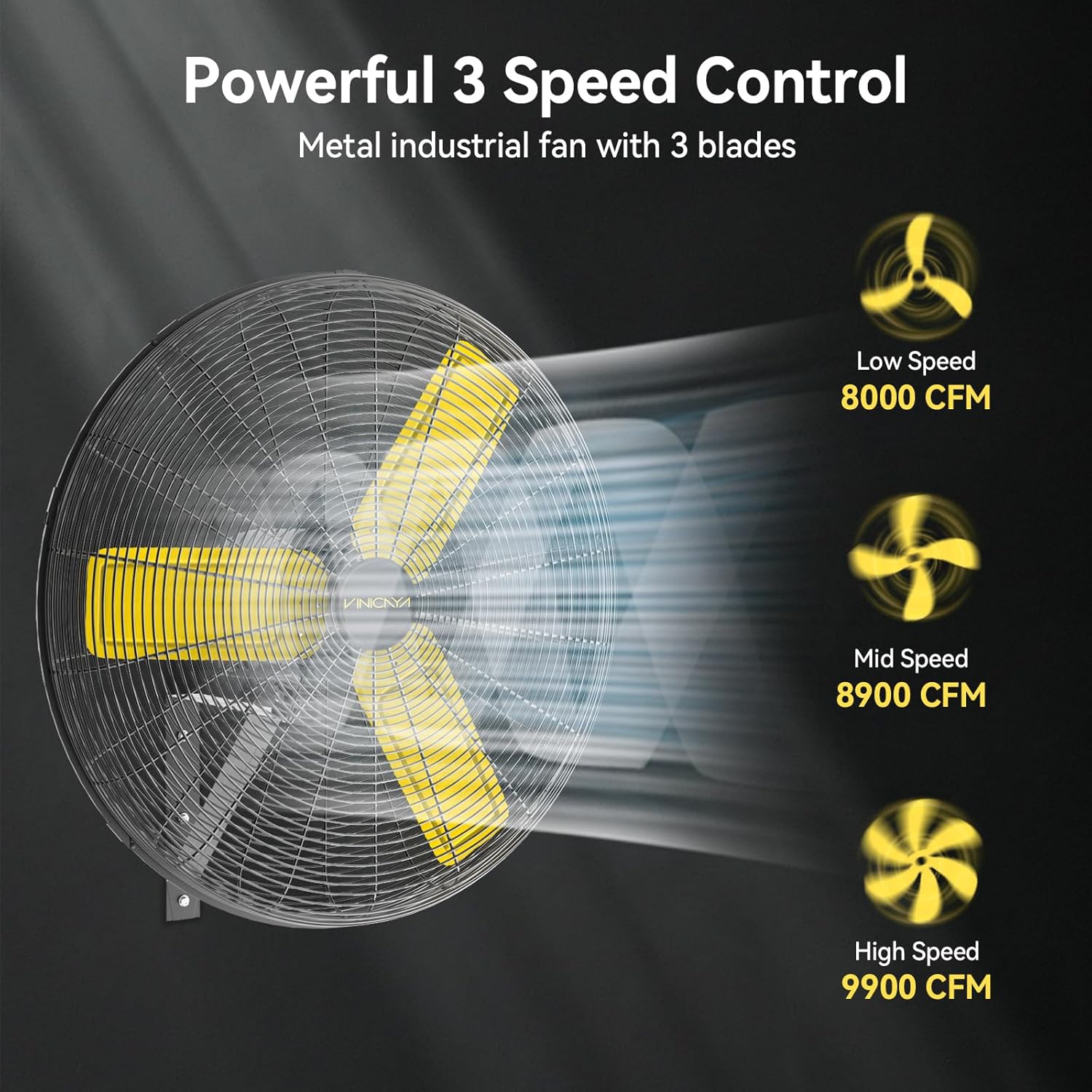 • 3 Speed Control: Offers three speed settings (low-8000 CFM, medium-8900 CFM, and high-9900 CFM) to allow you to customize the airflow intensity based on your specific cooling or ventilation requirements on the wall mount fan