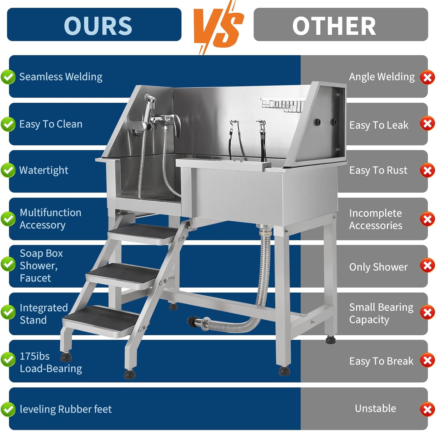 • Professional Stainless Steel Dog Washing Station — Durable & Leak-Proof:Built with premium stainless steel and seamless welding technology, our dog washing station ensures a leak-proof, scratch-resistant experience for all dogs. With a 220 lbs load capacity, this dog grooming tub is perfect for small, medium, and large dogs, suitable for both home and professional pet grooming use. Say goodbye to messy clean-ups with our pet bath solution.