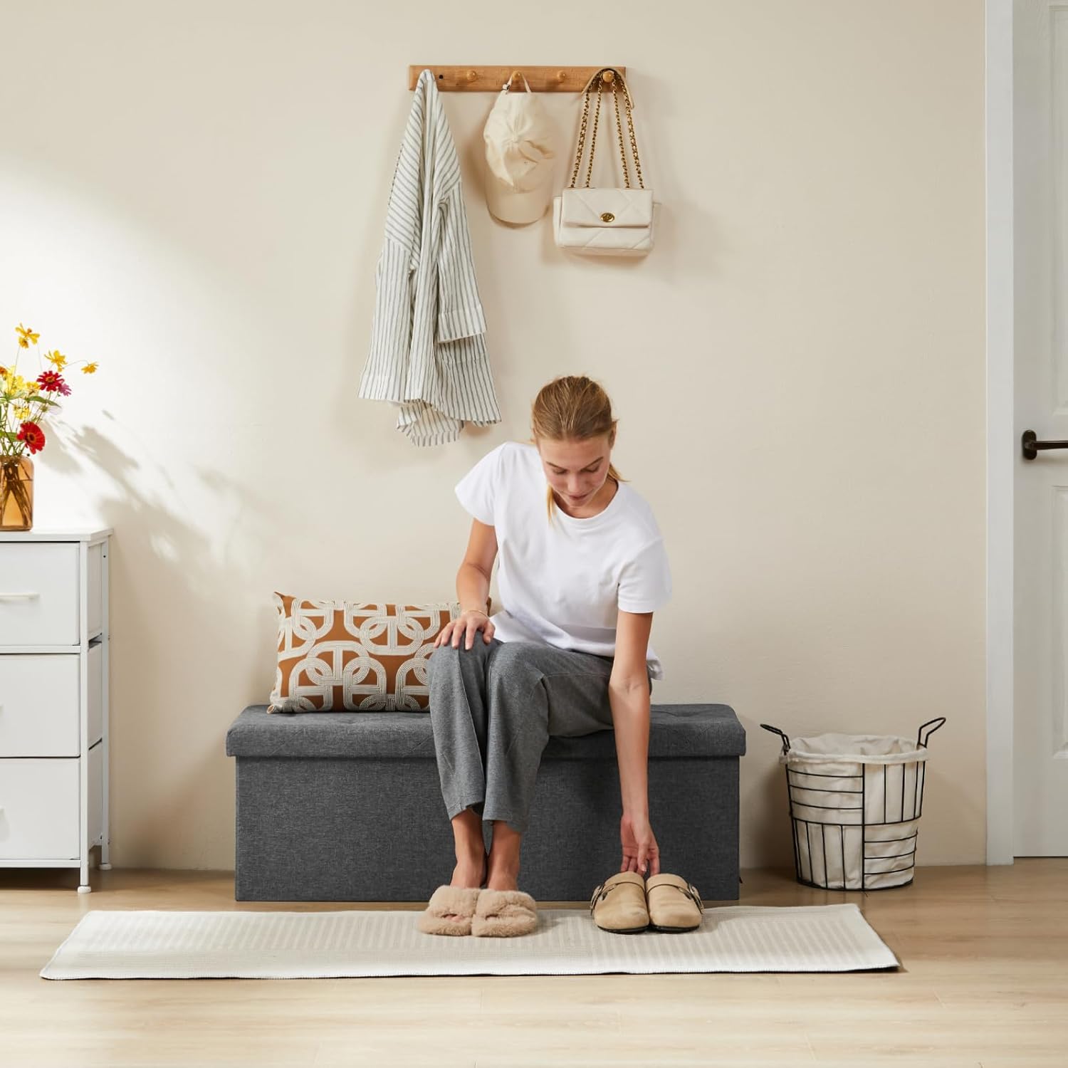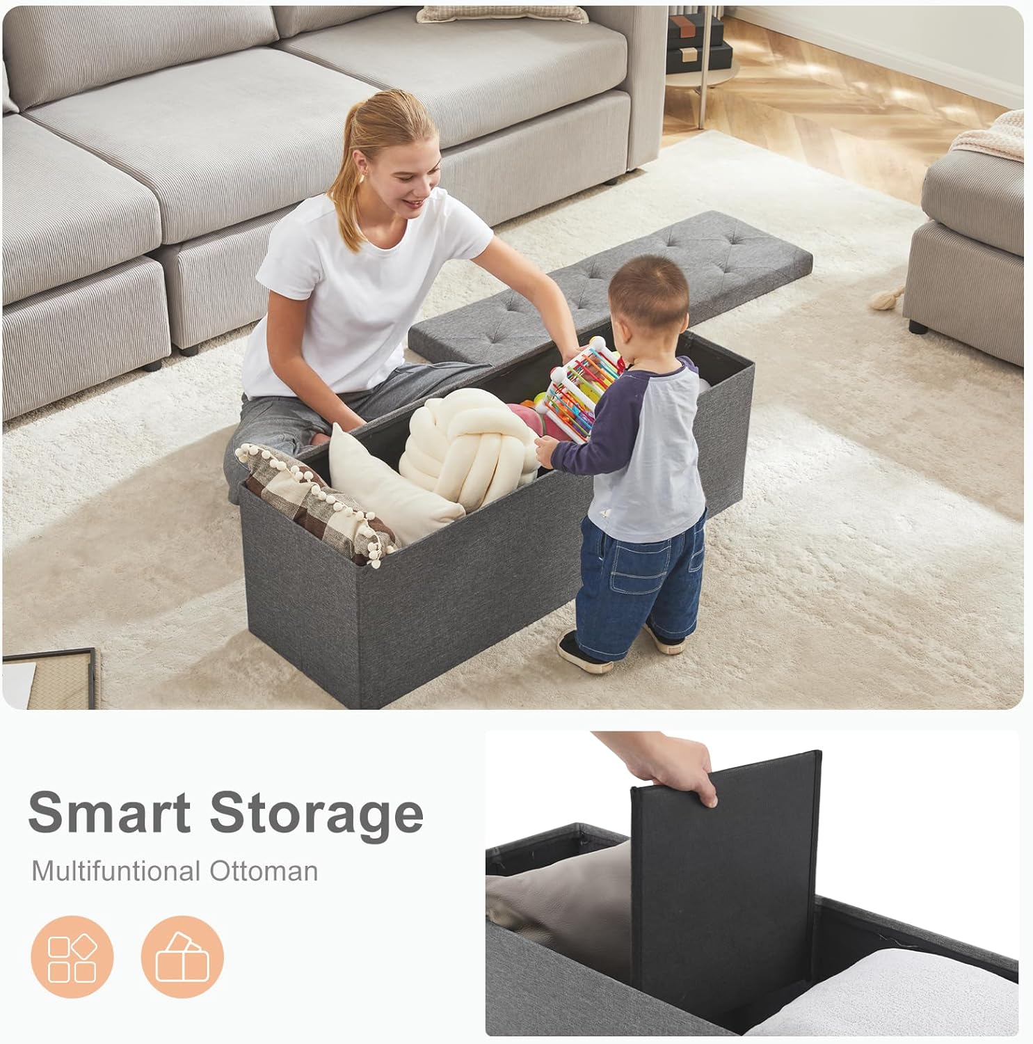 • ใ€Durable & Cozyใ€‘: This storage ottoman bench features thick MDF boards for solid stability. Its top is padded with high-density foam and wrapped in elegant gray linen fabric, offering both coziness and airiness. It can bear a static weight of up to 660 pounds.