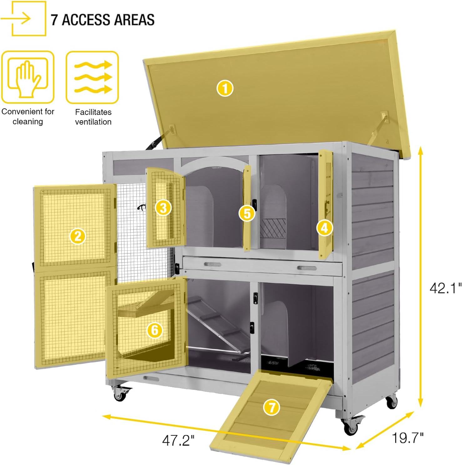 • ๐–๐š๐ญ๐ž๐ซ๐ฉ๐ซ๐จ๐จ๐Ÿ ๐‘๐จ๐จ๐Ÿ & ๐Œ๐จ๐›๐ข๐ฅ๐ž ๐‚๐š๐ฌ๐ญ๐ž๐ซ๐ฌ - Slanted roof protects against rain, while 360ยฐ casters allow easy movement. Ideal for indoor use as a bunny house, ensuring convenience and weather protection