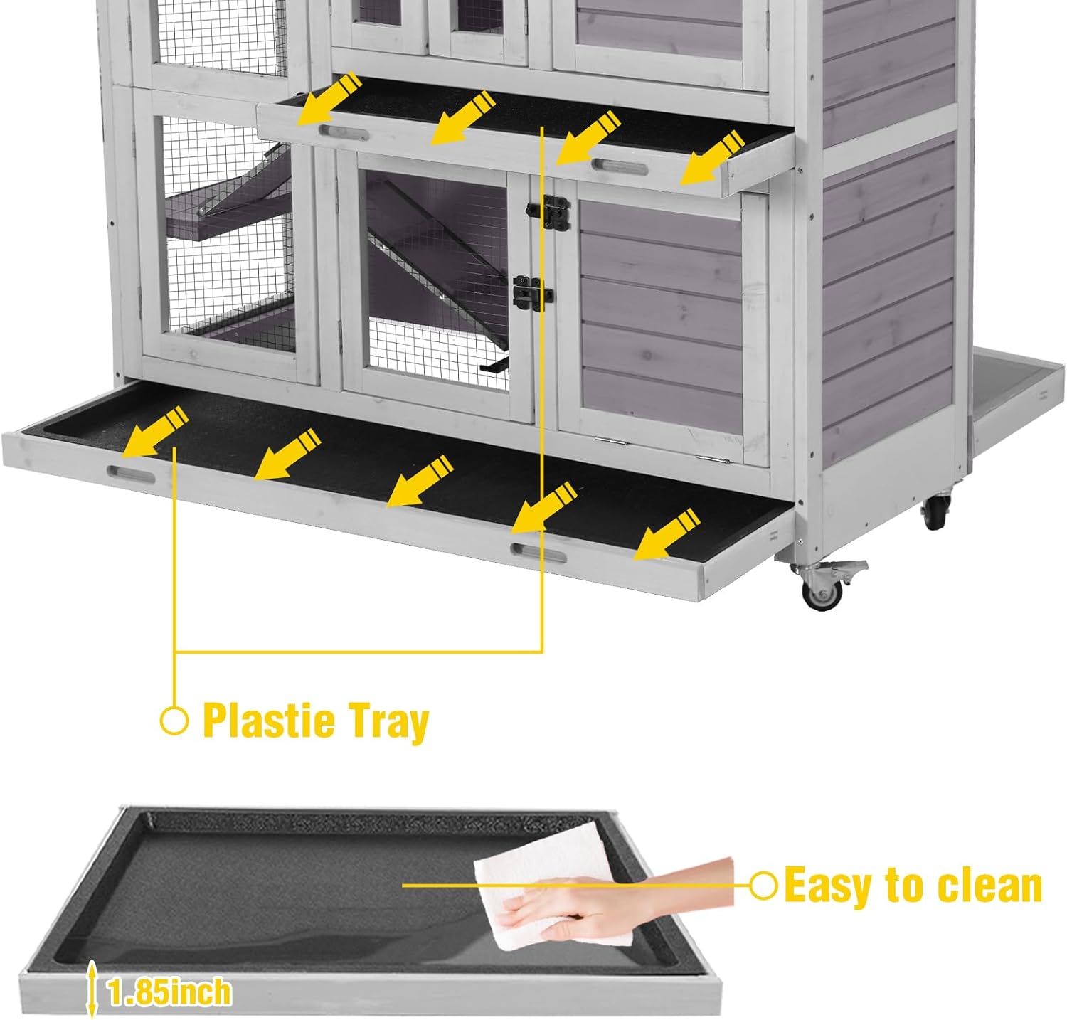 • ๐ƒ๐ž๐ž๐ฉ ๐‹๐ž๐š๐ค - ๐๐ซ๐จ๐จ๐Ÿ ๐ƒ๐จ๐ฎ๐›๐ฅ๐ž ๐“๐ซ๐š๐ฒ๐ฌ - Two deep, leak - proof plastic trays make cleaning effortless, ensuring no spills or rust. A premium feature of this rabbit hutch for lasting hygiene