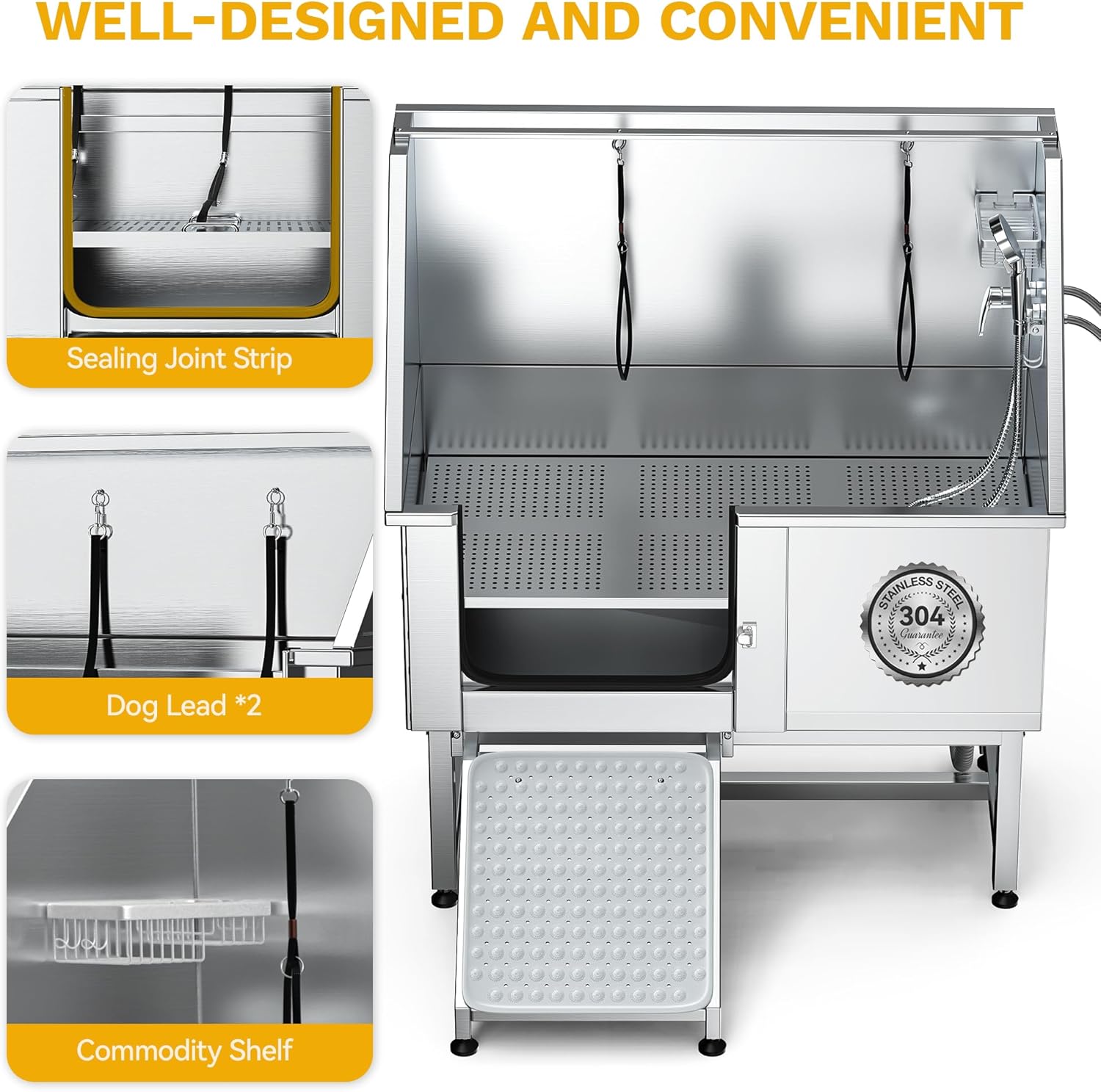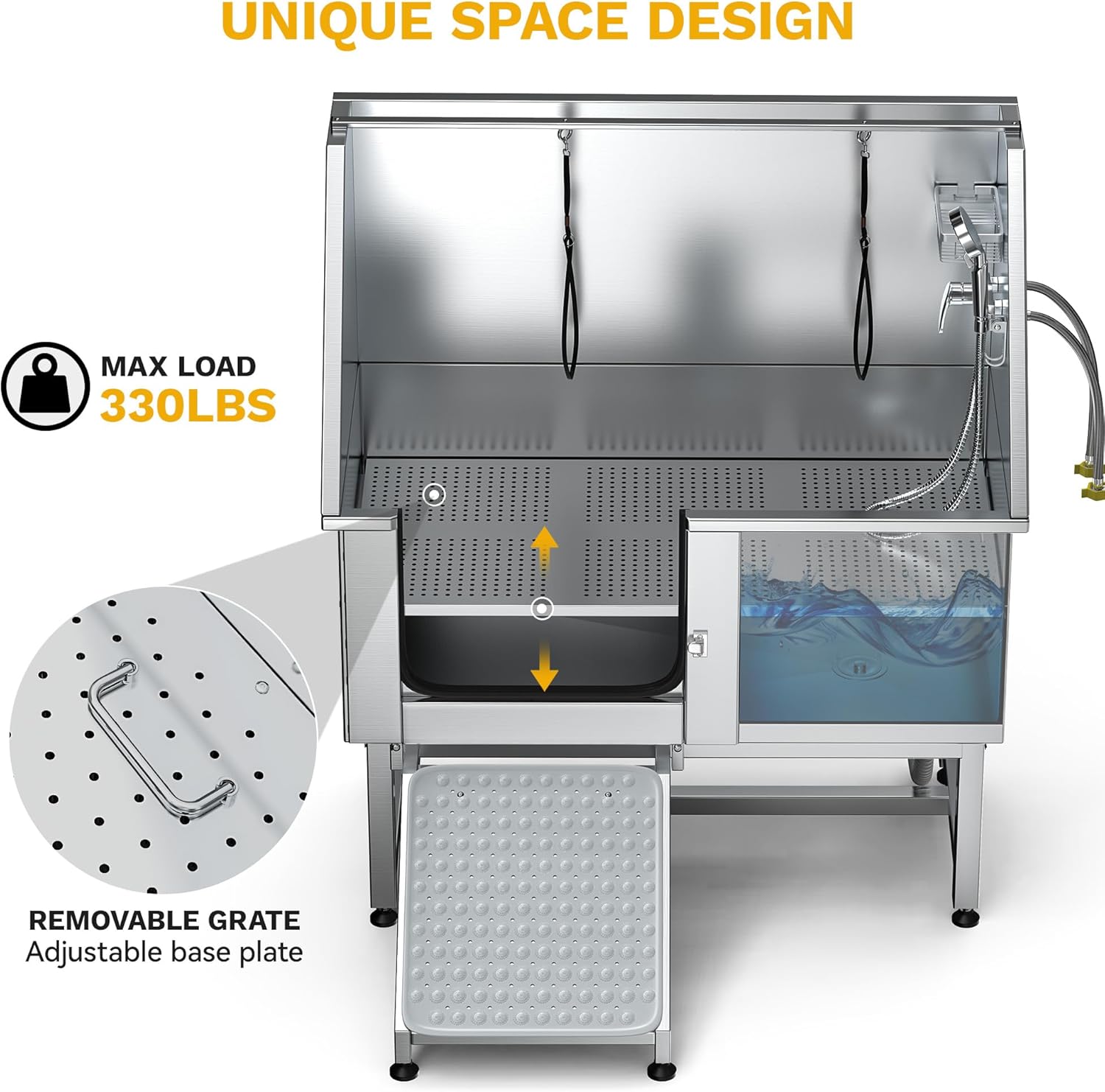 • Durable 304 Stainless Steel Tub Body: With a 330 lb weight capacity, this pet bathtub is built for long-lasting use; The fully welded, one-piece design prevents leaks, while the smooth surface allows for easy cleaning and maintenance