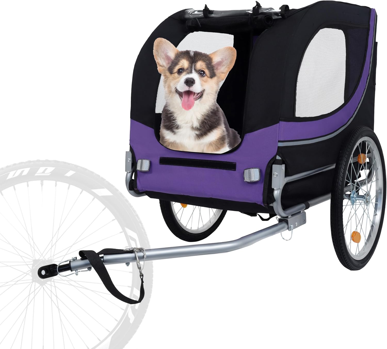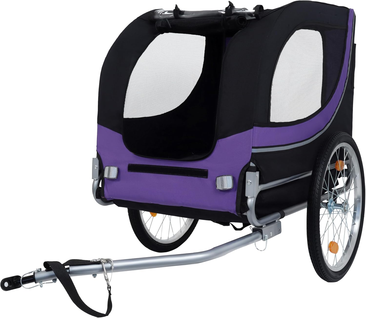 • Trendy Color Combination: Available in a fashionable Purple and Black color scheme, this dog bike trailer not only provides functionality but also style. Stand out while enjoying your cycling journey with your beloved pets in this eye-catching design.
