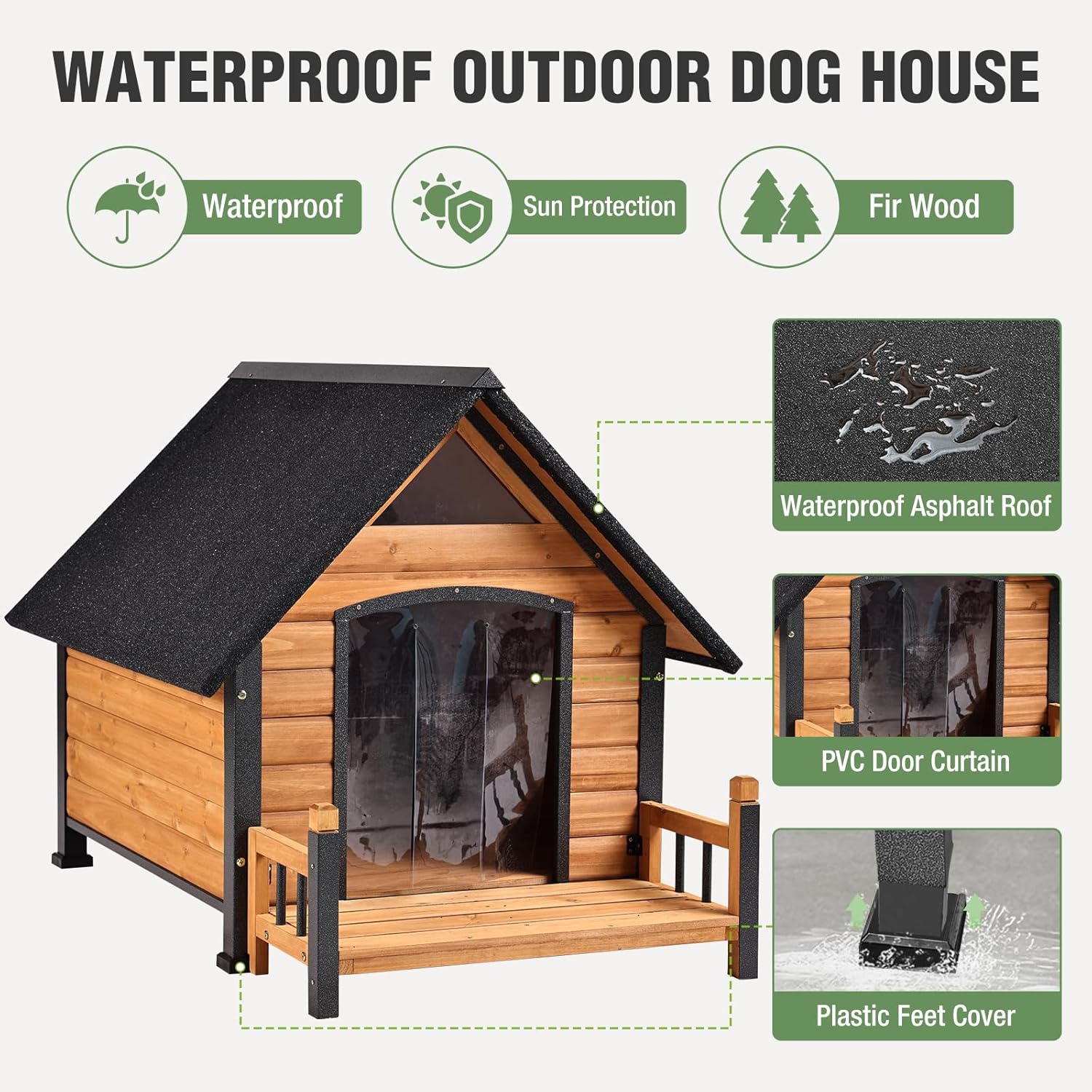 • Easy to Clean and Maintain: The dog house has a wooden floor at the bottom, which is easy to clean and maintain. The removable floor design facilitates daily cleaning, keeping the inside of the dog house tidy and clean. The transparent PVC door curtain not only keeps out wind and insects but also allows you to monitor your pet's condition at any time.