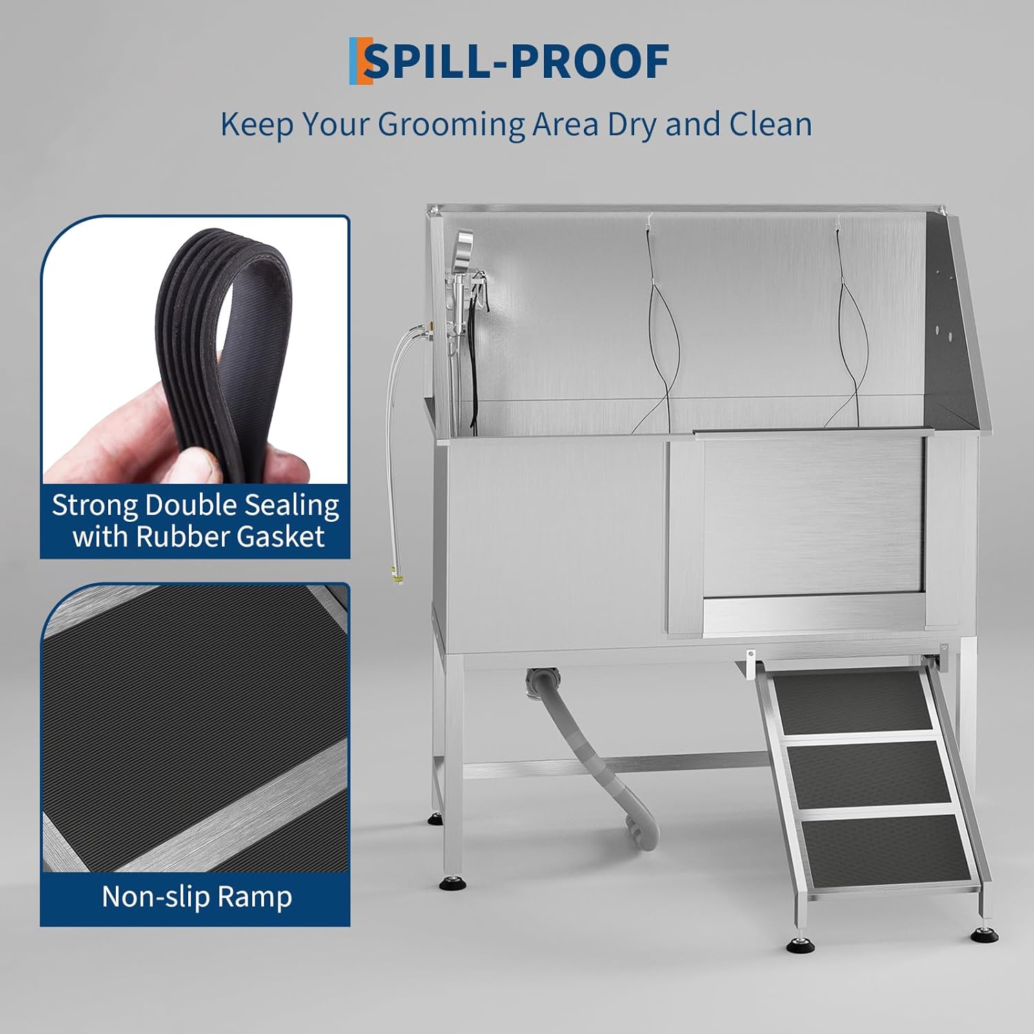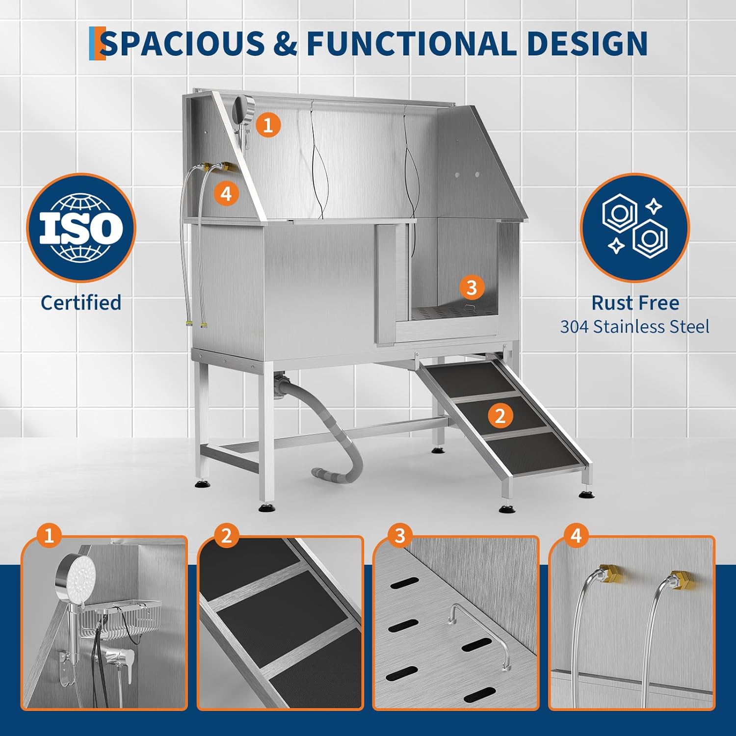 • Safety-Equipped Wash Tub Includes non-slip access ramp, storage cabinet, and locking gate mechanism to secure pets during bathing procedures.