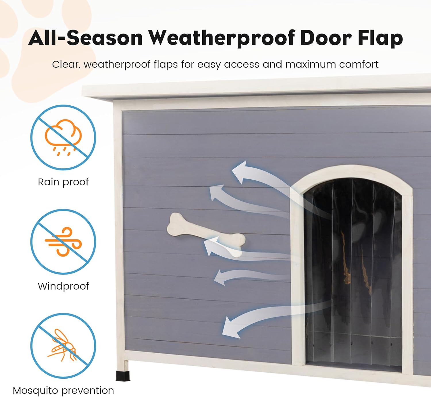 • [Specially Designed for Outdoor Use] The sloping asphalt roof is expertly engineered to prevent rainwater from pooling, ensuring that your pet's living space remains dry and comfortable. The floor is 2.4’’ above the ground, and there is a removable PVC curtain and adaptable floor pads for uneven ground. This design enables the dog house to withstand harsh weather conditions, preventing water from seeping in and materials from getting damp