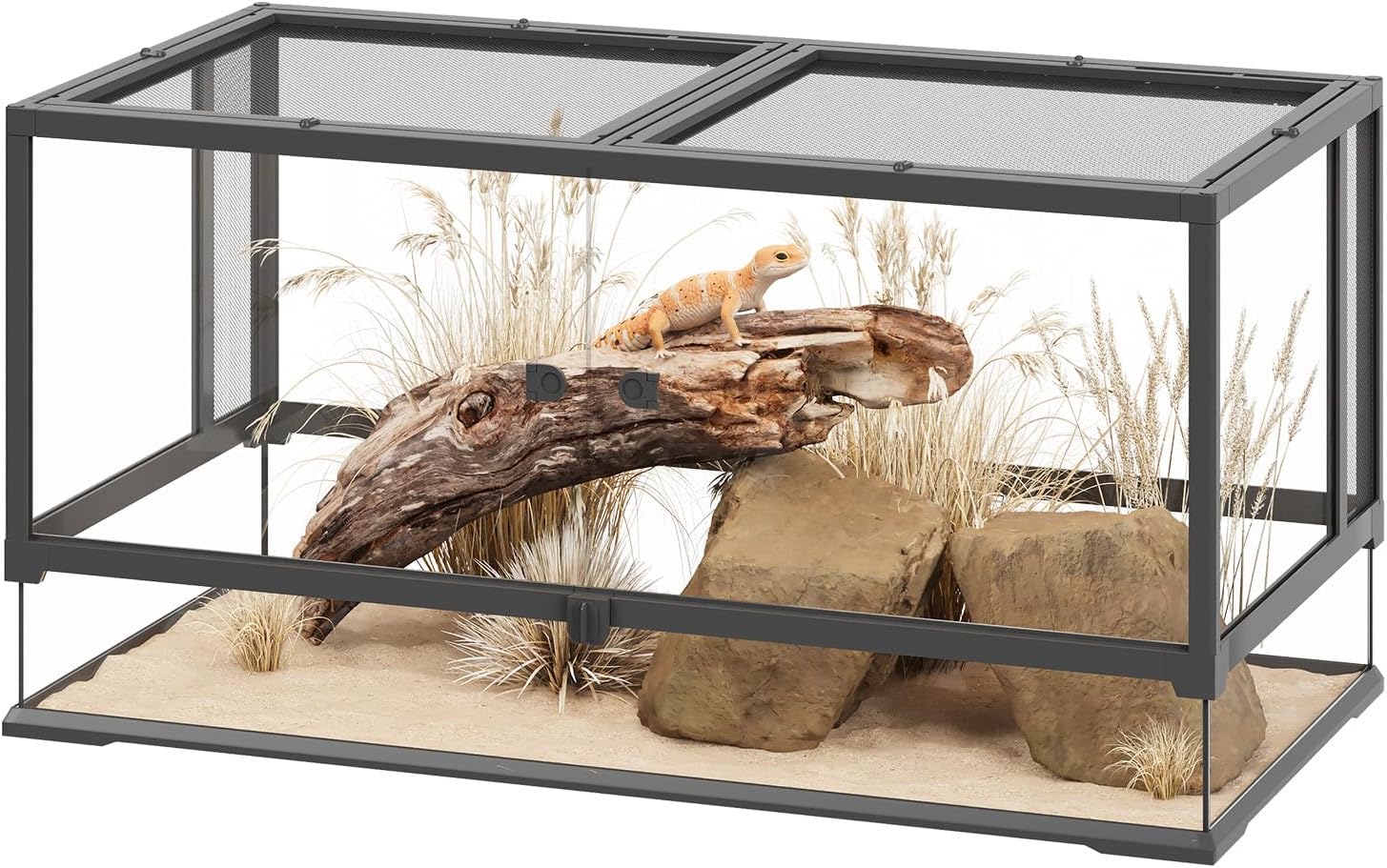 • Ventilated Design: Our reptile terrarium features interchangeable glass or mesh panels for rainforest or desert habitats, plus a mesh top and side vents for airflow. Removable lid and front-opening glass doors make feeding and cleaning simple